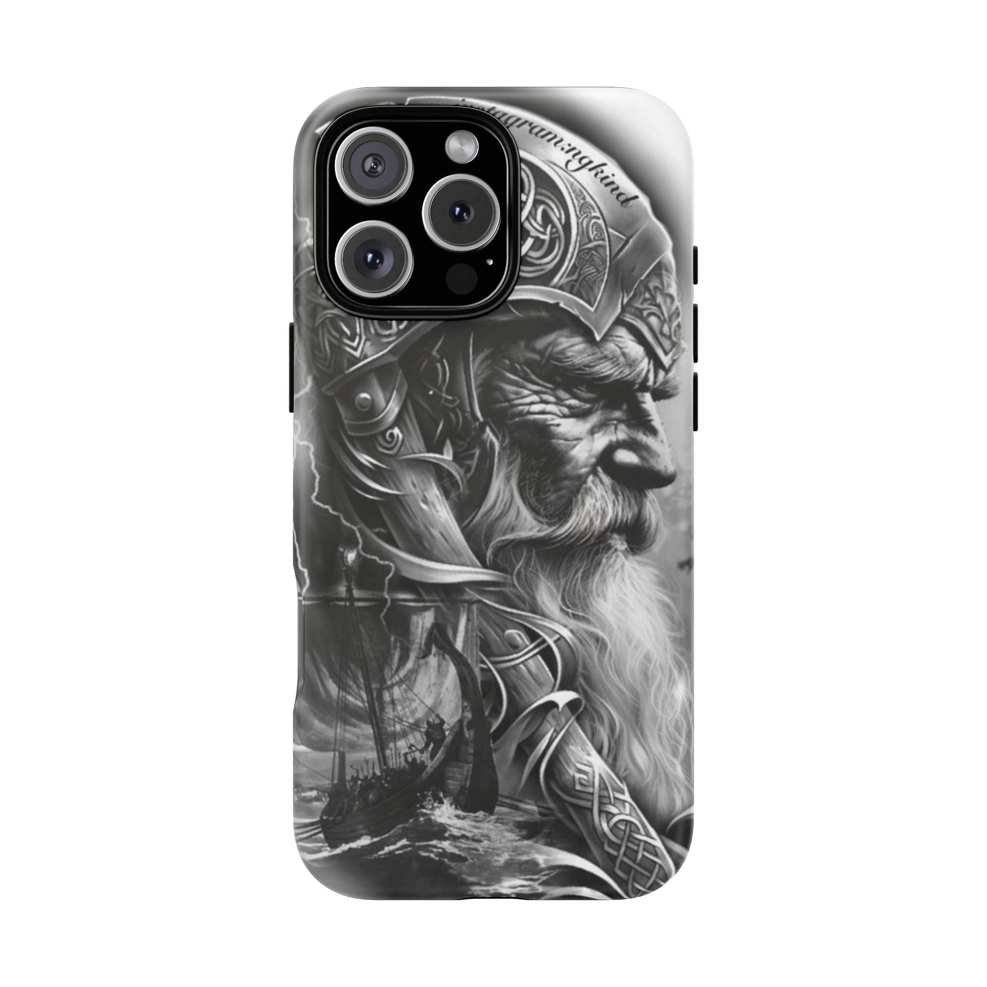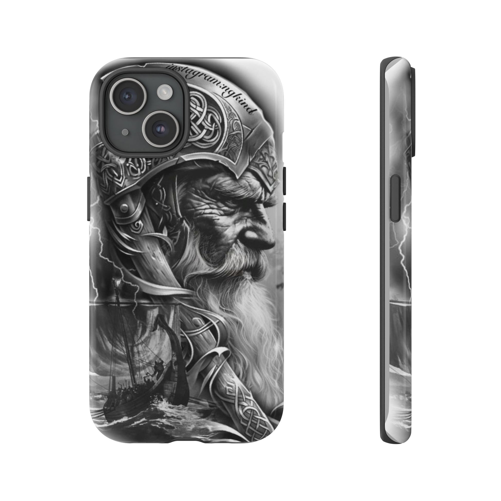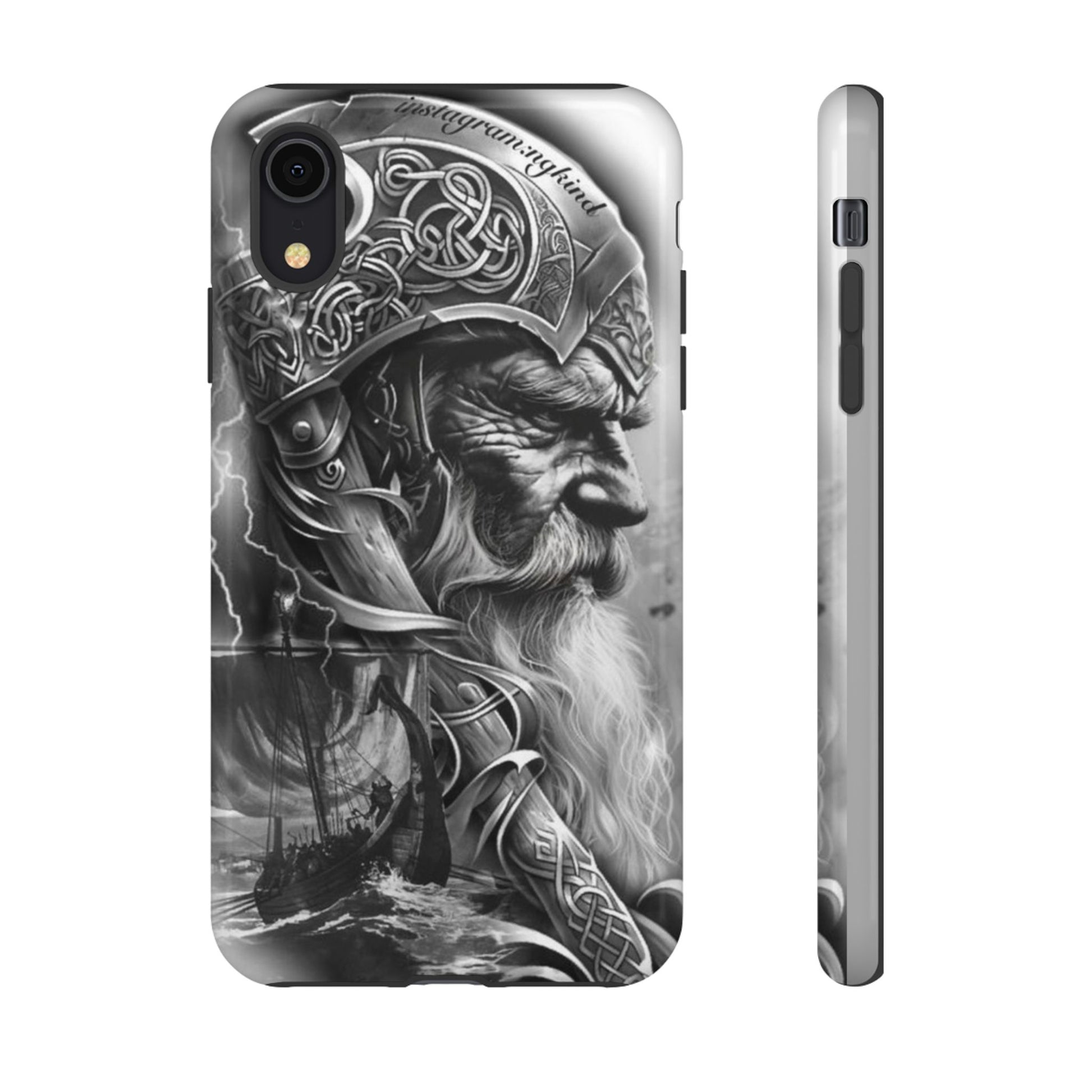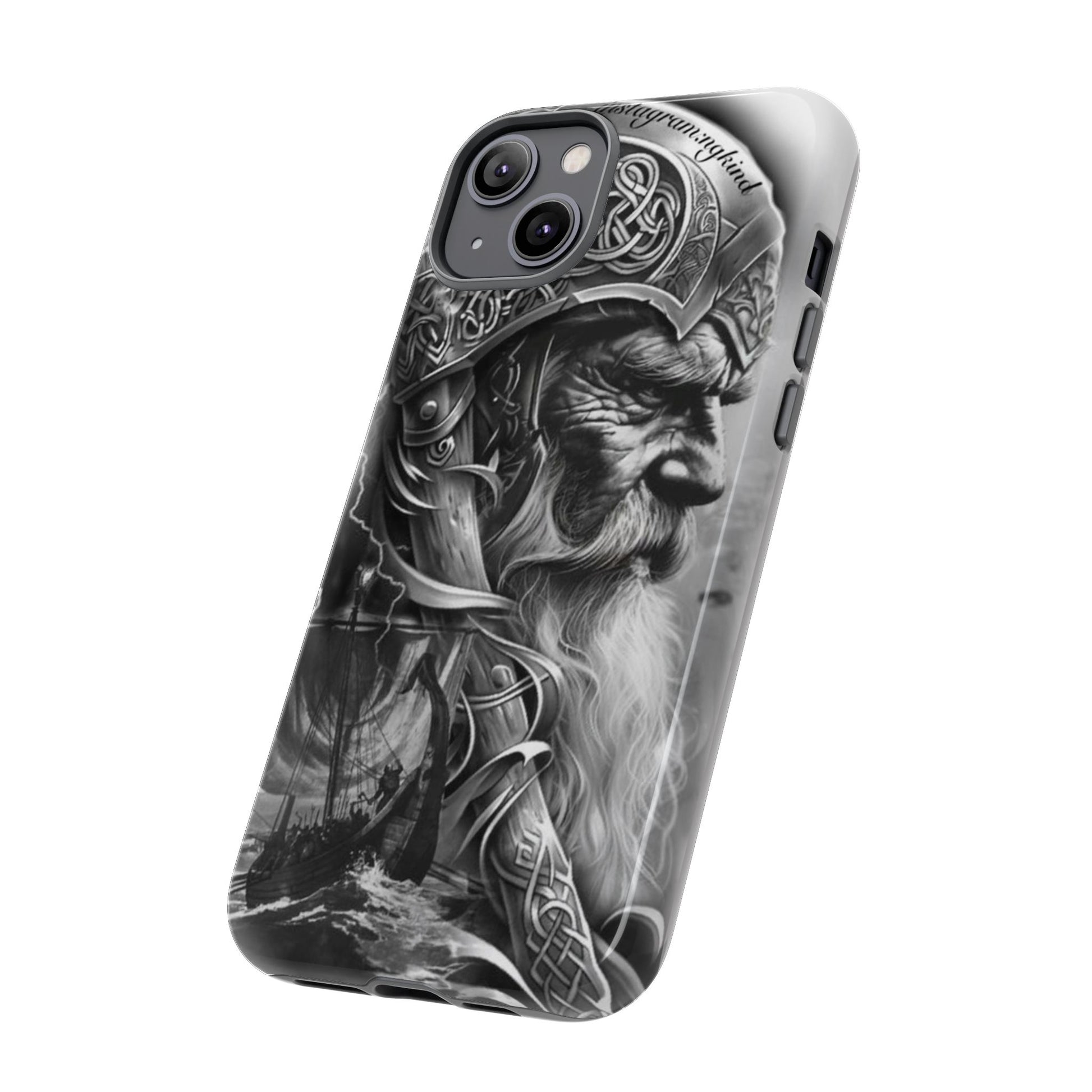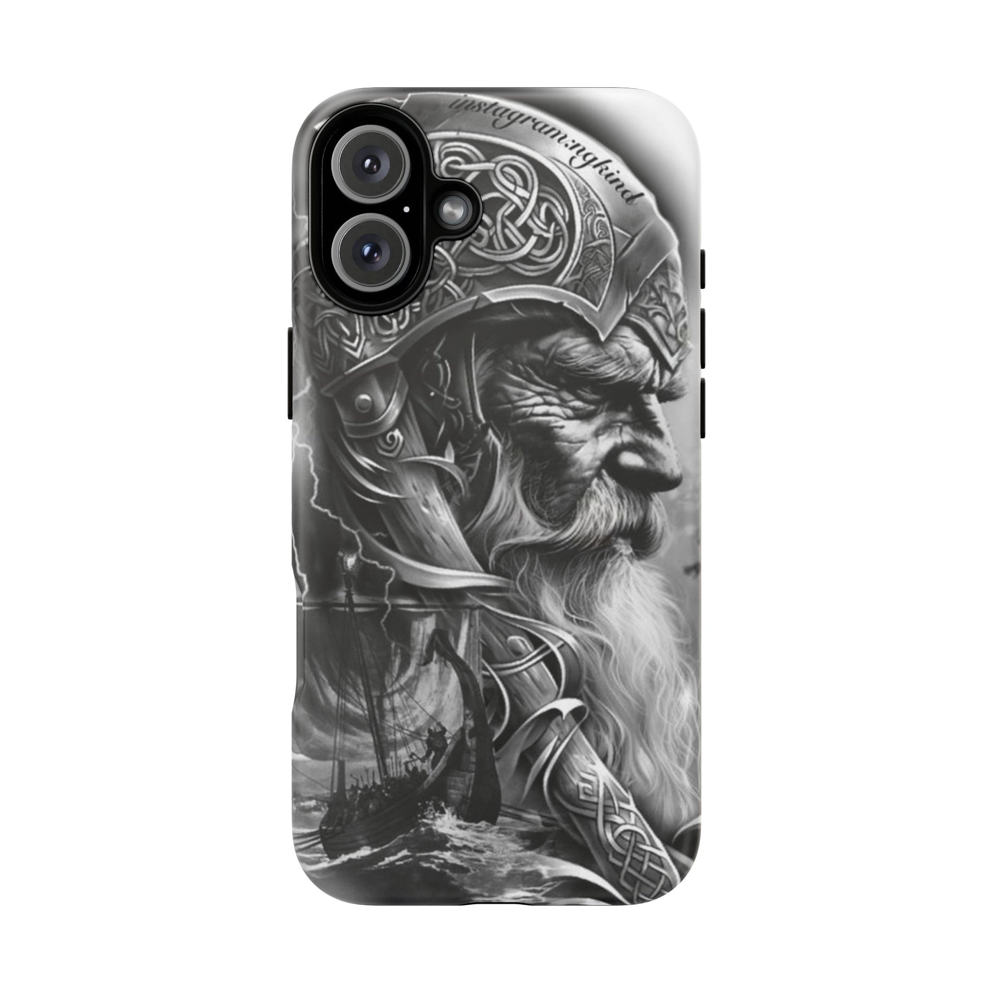 A powerful grayscale Viking-themed iPhone case featuring a detailed Norse warrior with braided beard, ornate helmet engravings, and a longship sailing through stormy seas. Perfect for fans of Vikings, Odin lore, Nordic history, and ancient warrior spirit. Bold, mythic, and masculine—ideal for those who love strength, battle aesthetics, and warrior heritage style.