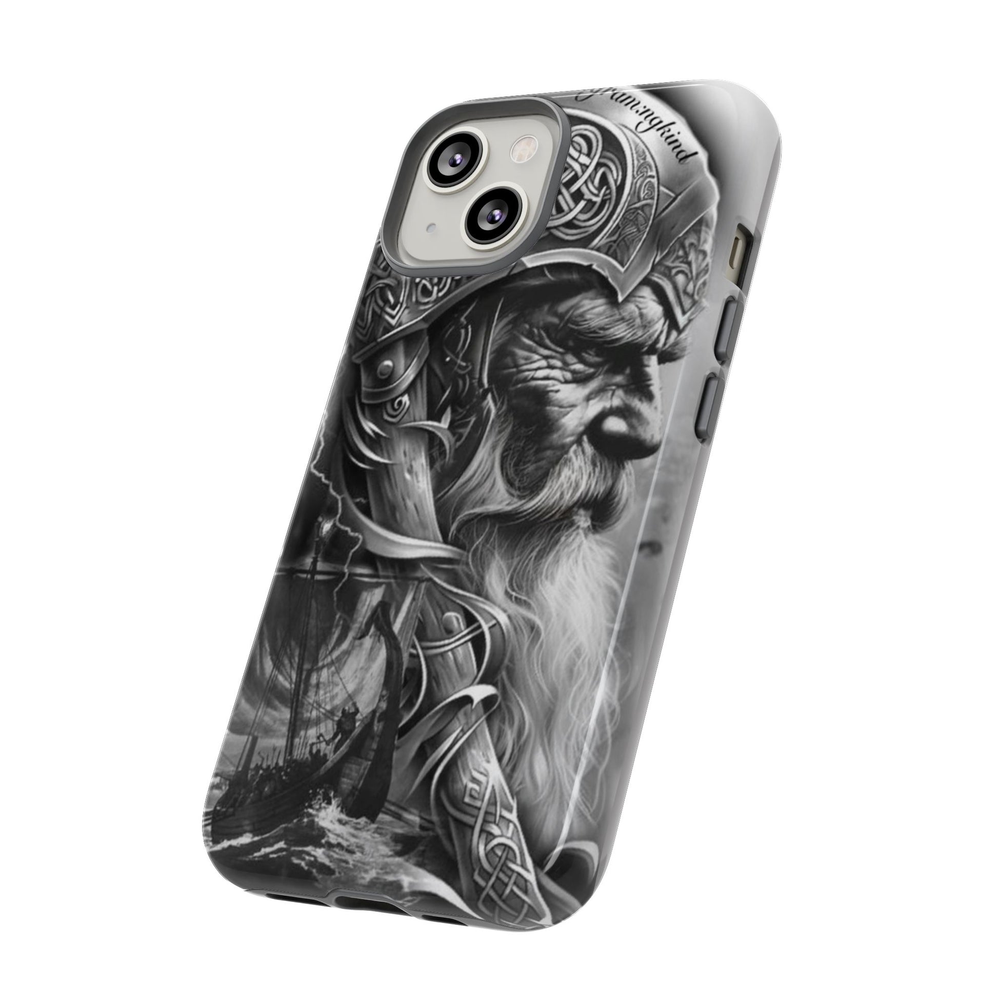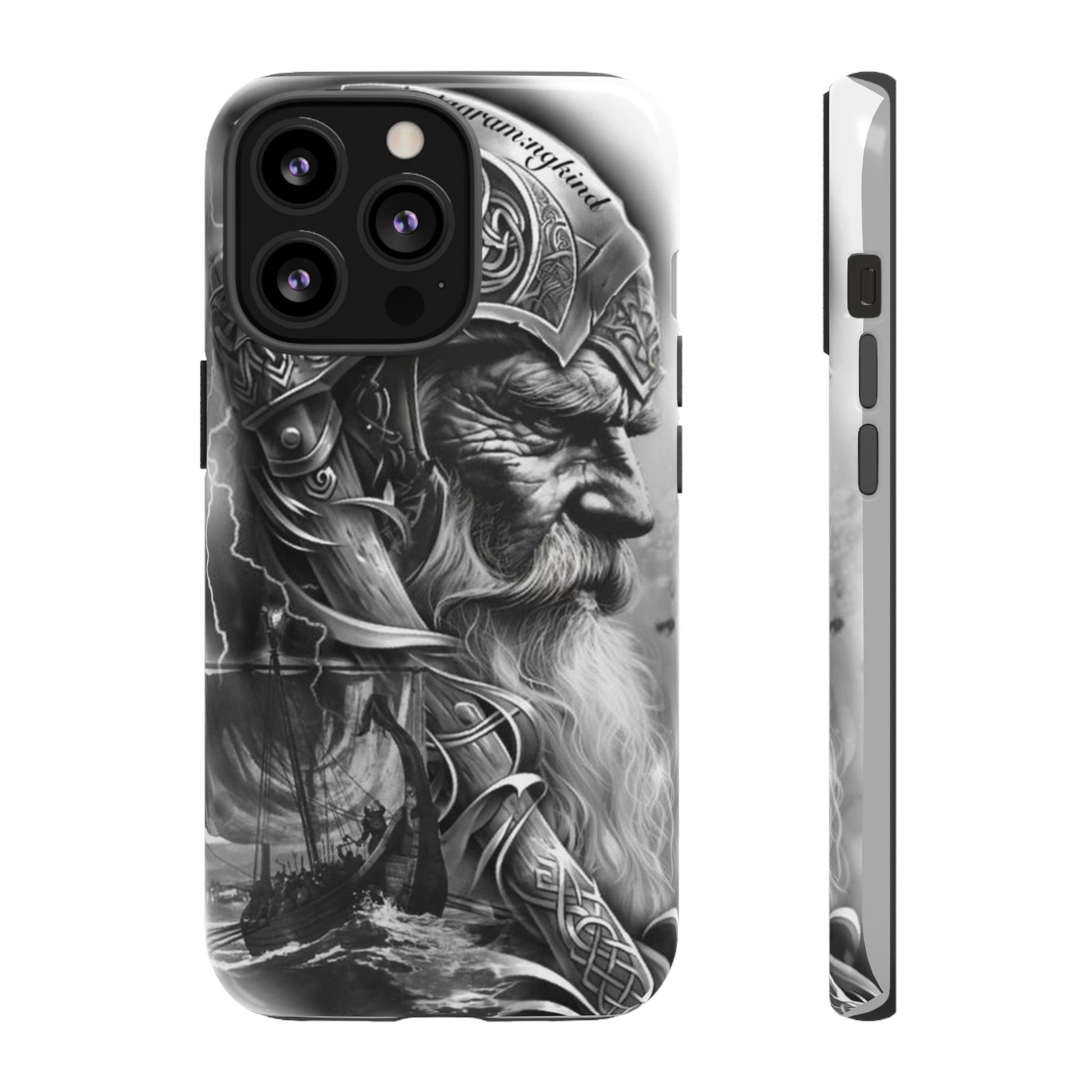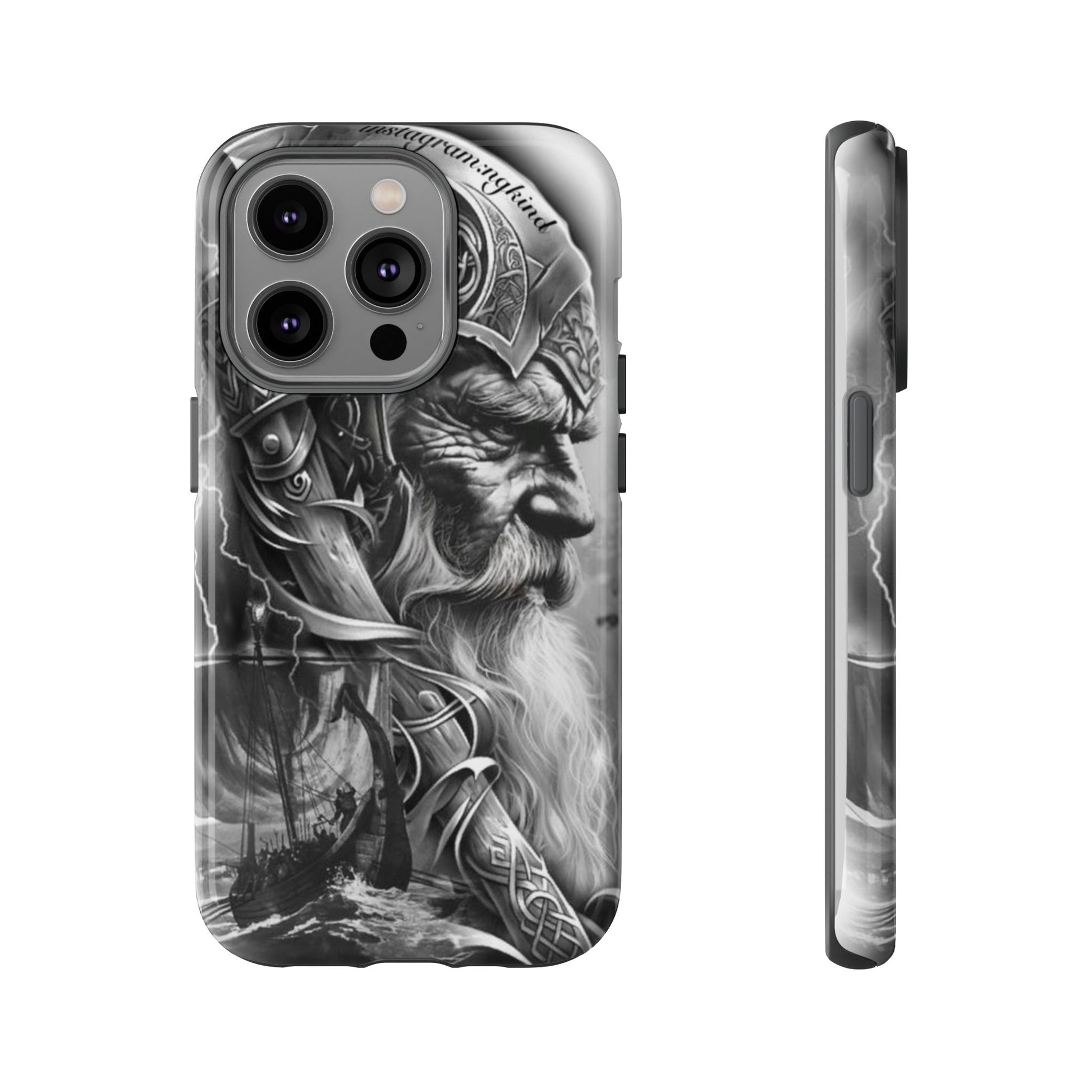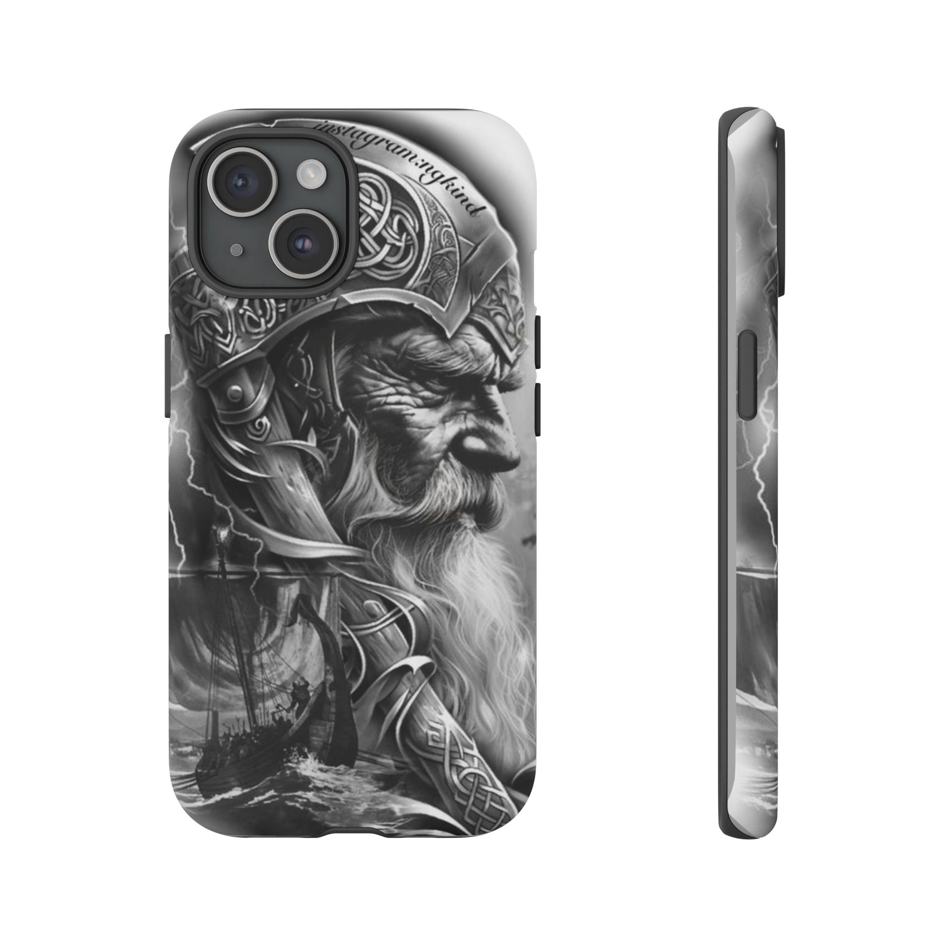 A powerful grayscale Viking-themed iPhone case featuring a detailed Norse warrior with braided beard, ornate helmet engravings, and a longship sailing through stormy seas. Perfect for fans of Vikings, Odin lore, Nordic history, and ancient warrior spirit. Bold, mythic, and masculine—ideal for those who love strength, battle aesthetics, and warrior heritage style.
