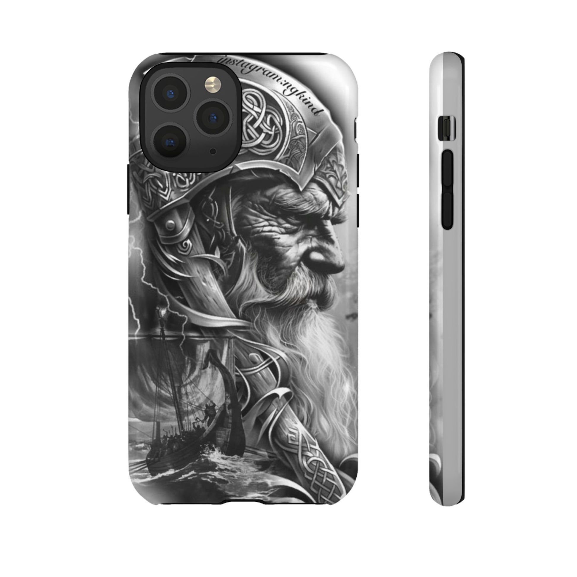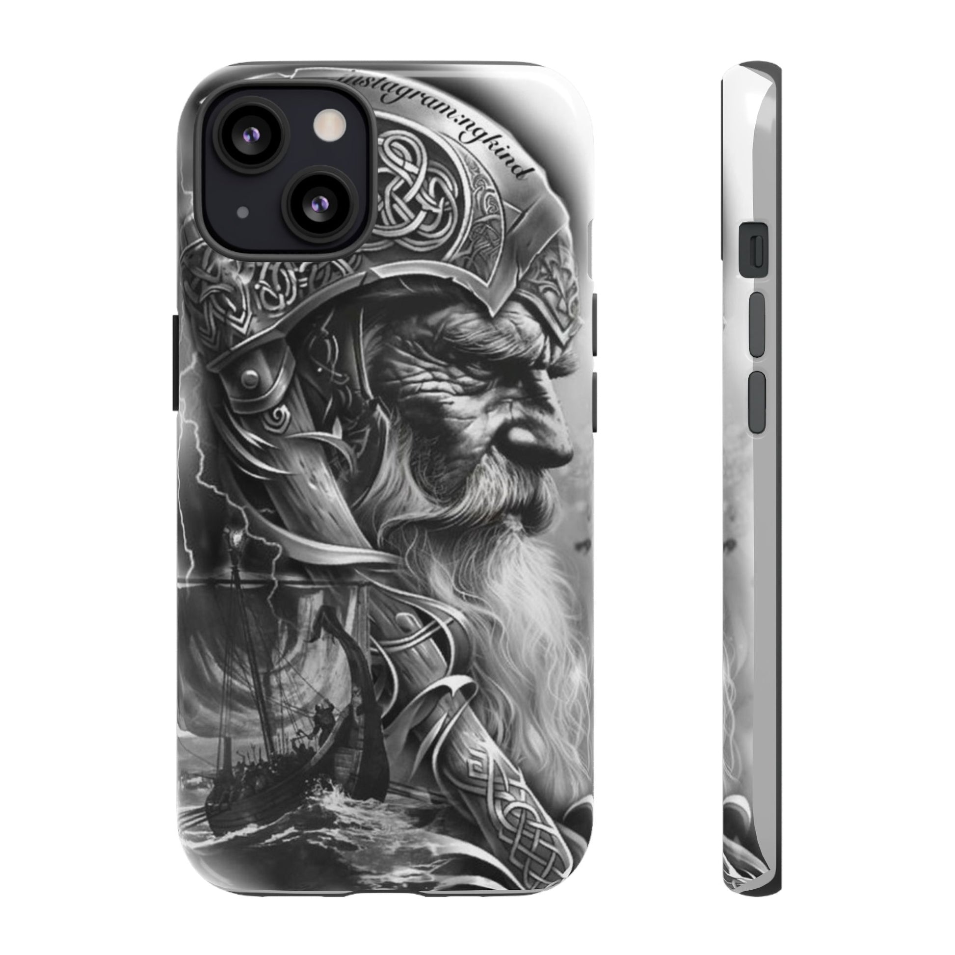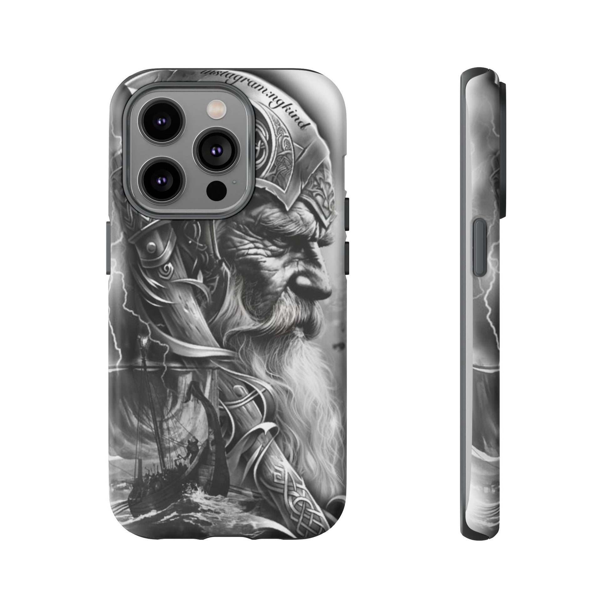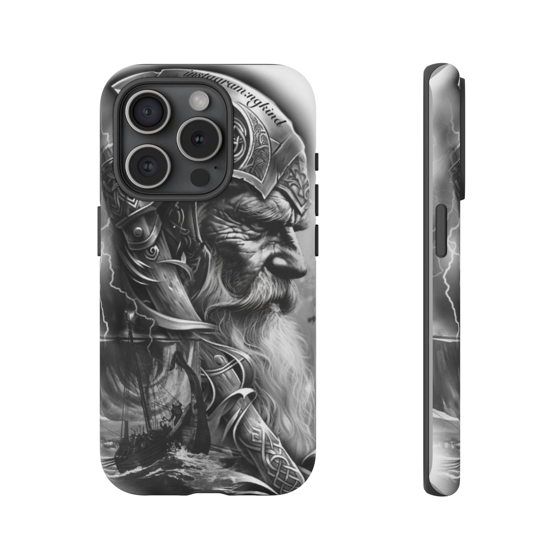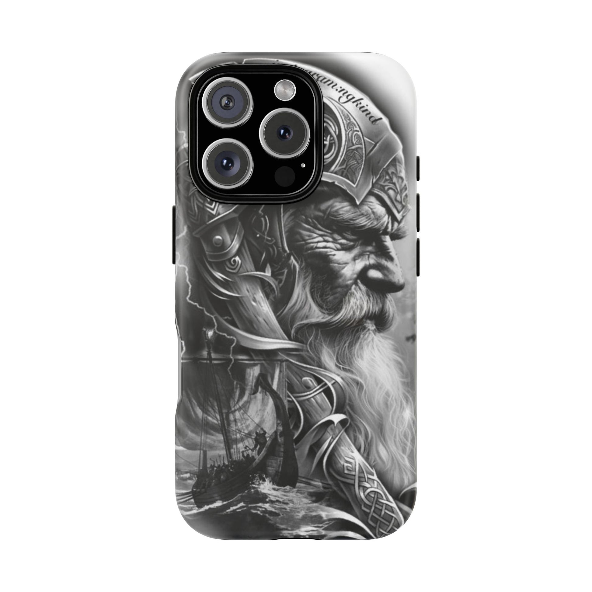 A powerful grayscale Viking-themed iPhone case featuring a detailed Norse warrior with braided beard, ornate helmet engravings, and a longship sailing through stormy seas. Perfect for fans of Vikings, Odin lore, Nordic history, and ancient warrior spirit. Bold, mythic, and masculine—ideal for those who love strength, battle aesthetics, and warrior heritage style.