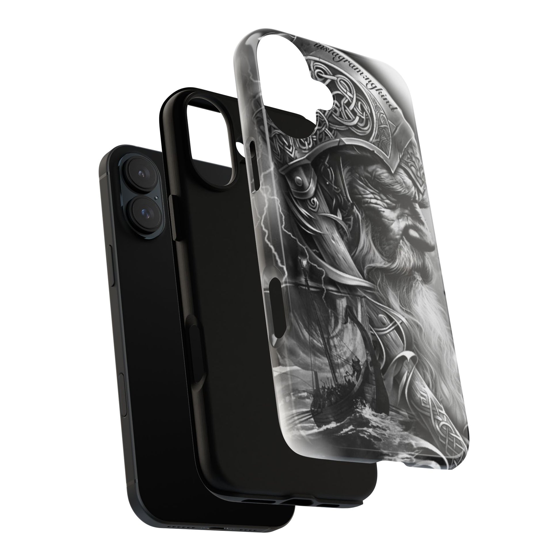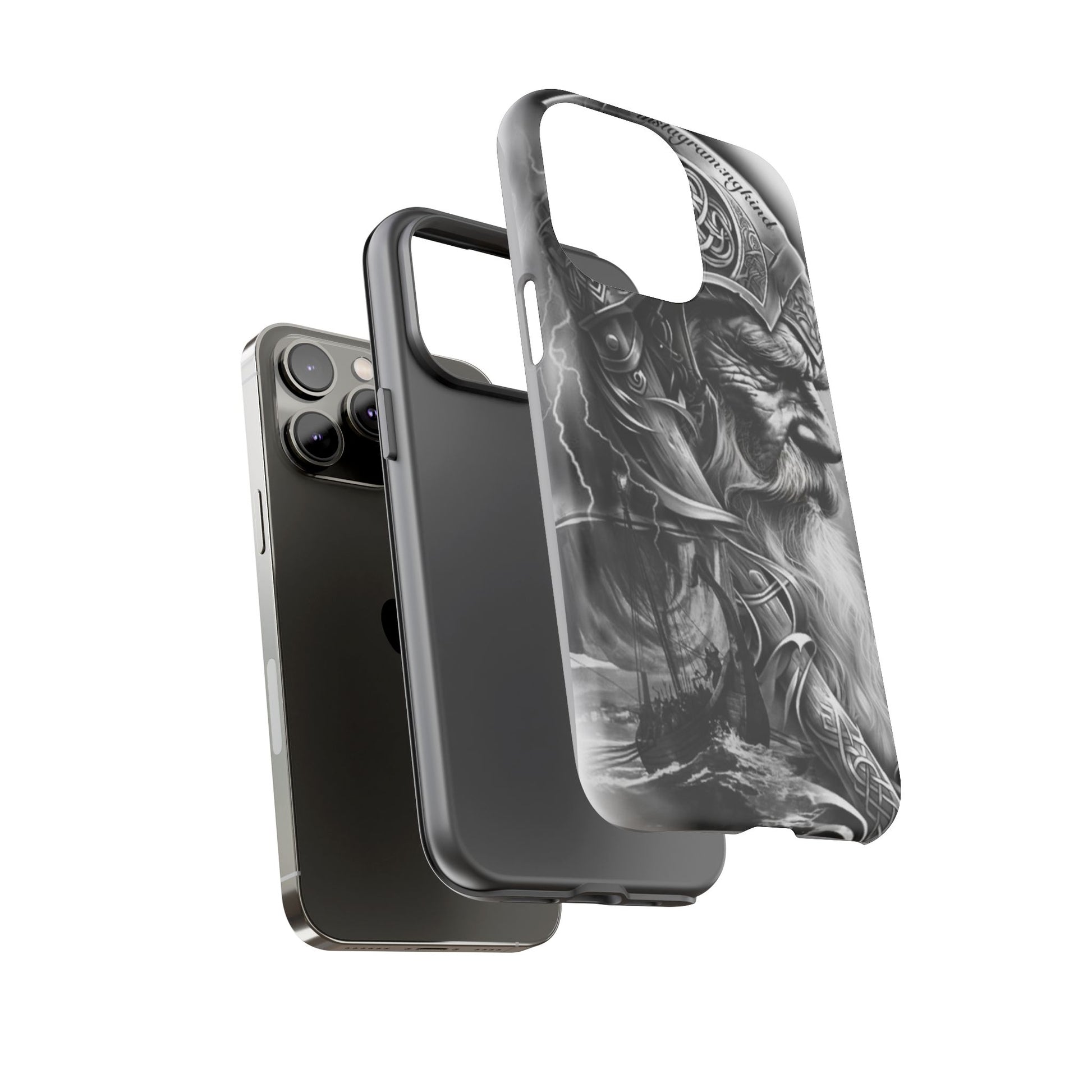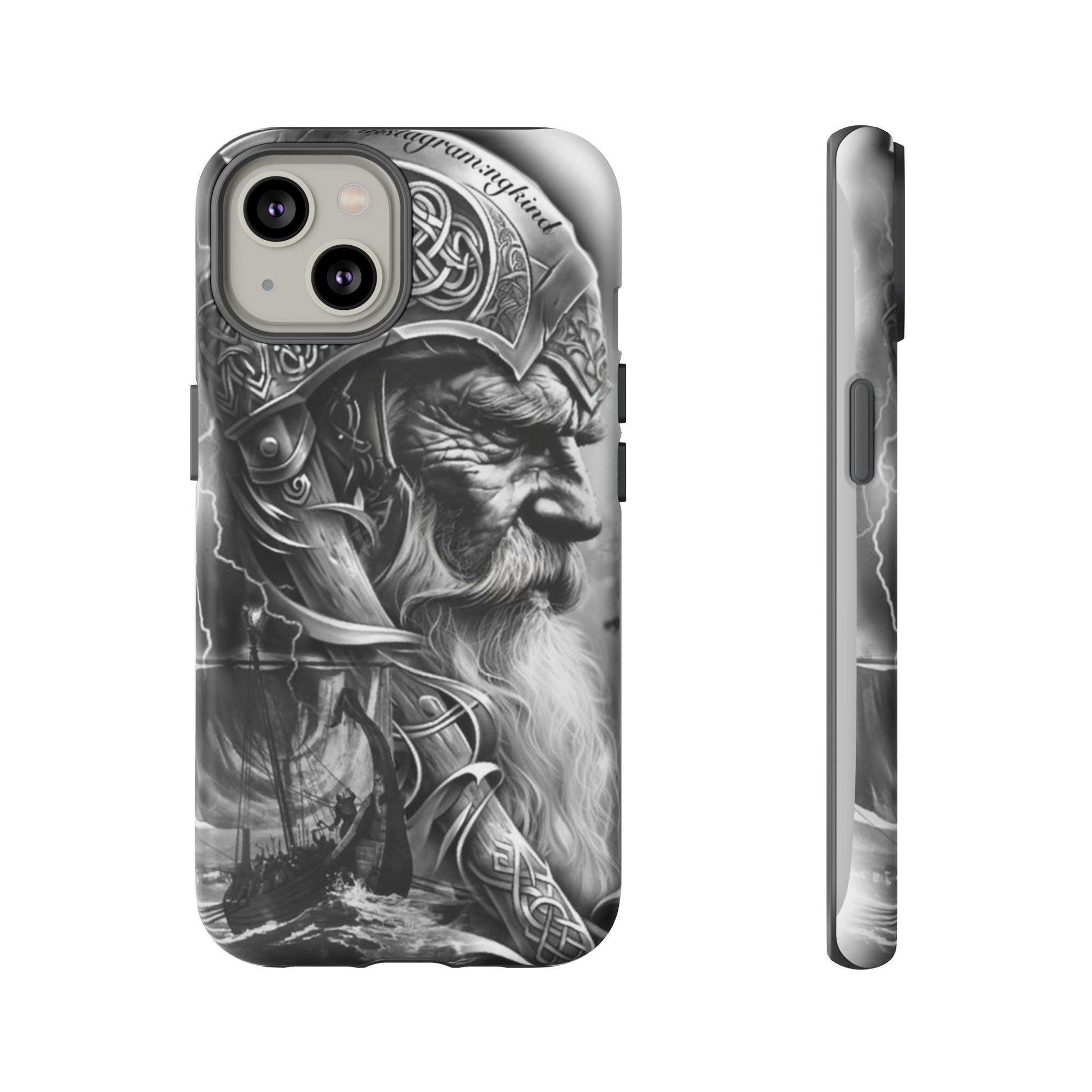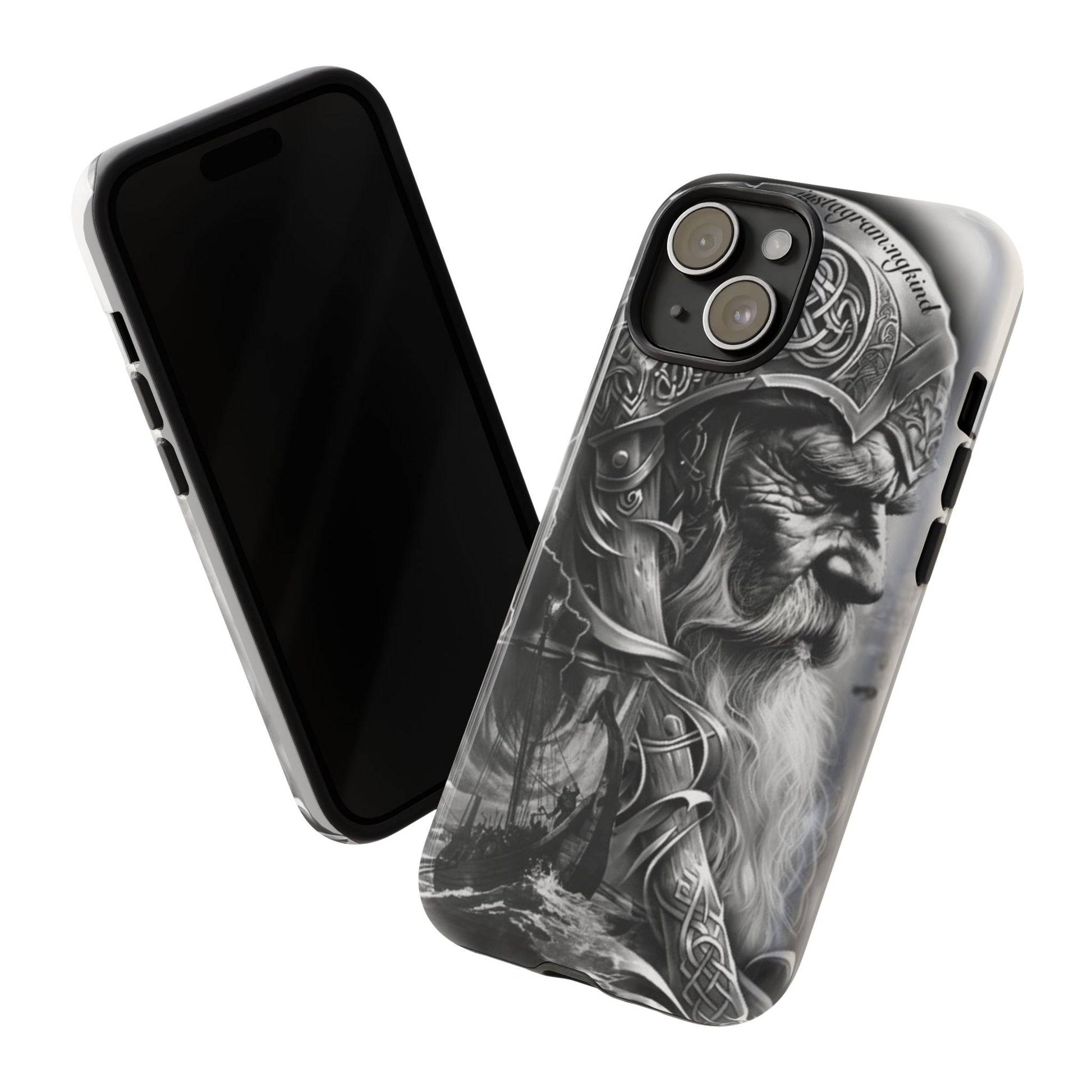 A powerful grayscale Viking-themed iPhone case featuring a detailed Norse warrior with braided beard, ornate helmet engravings, and a longship sailing through stormy seas. Perfect for fans of Vikings, Odin lore, Nordic history, and ancient warrior spirit. Bold, mythic, and masculine—ideal for those who love strength, battle aesthetics, and warrior heritage style.