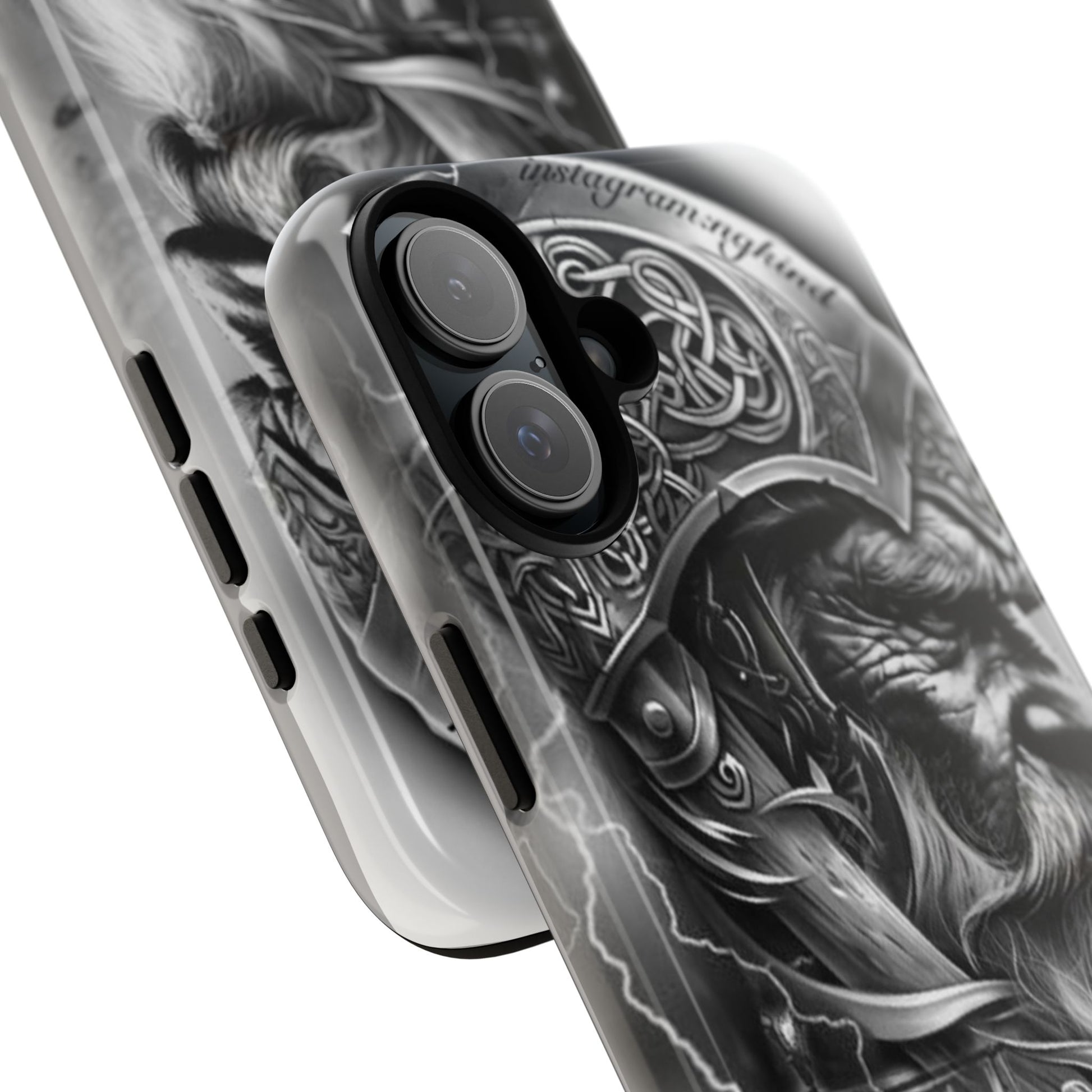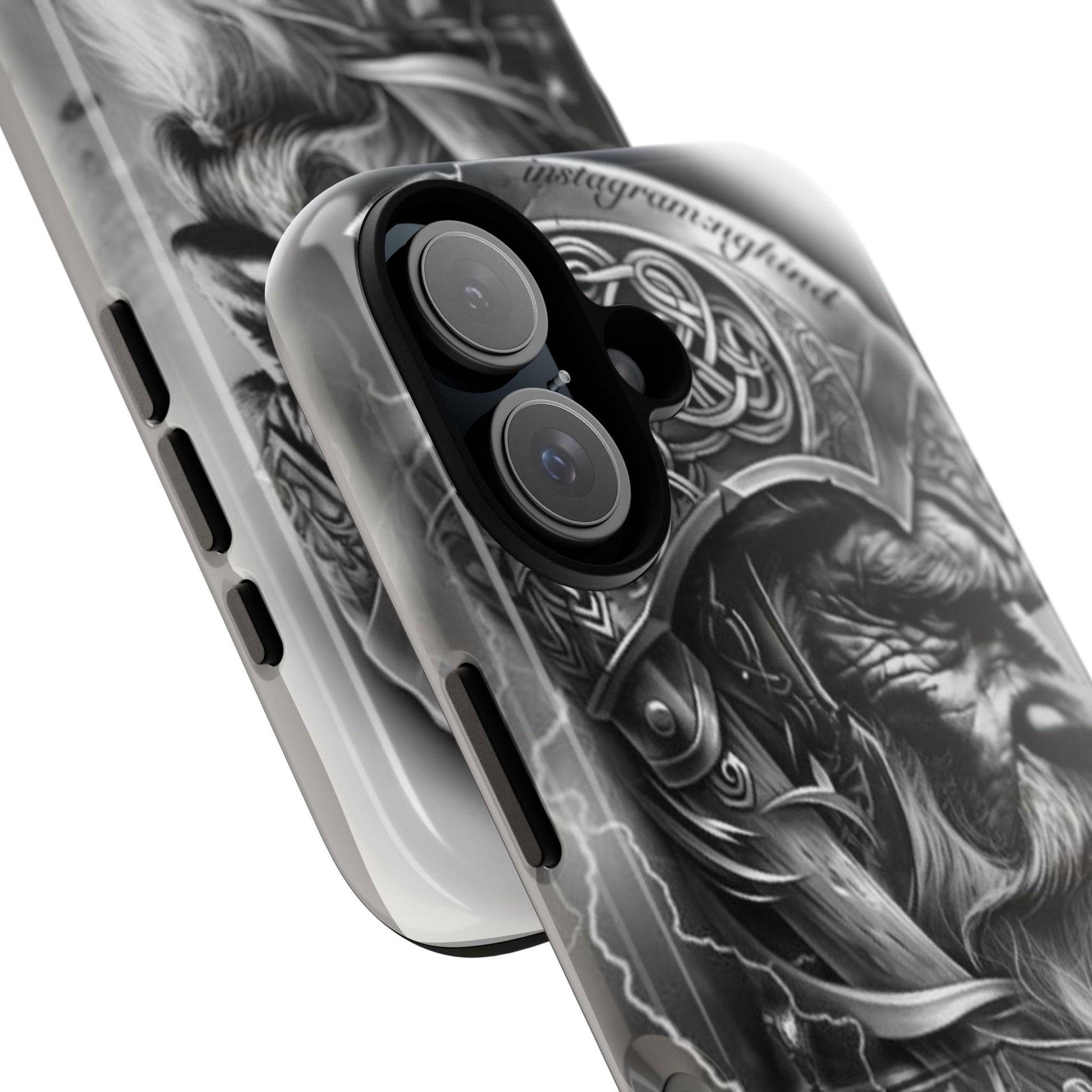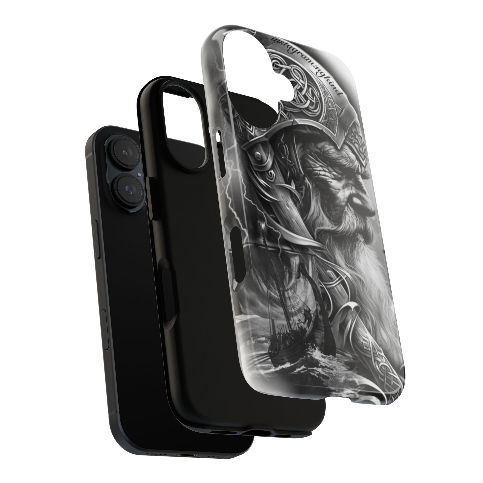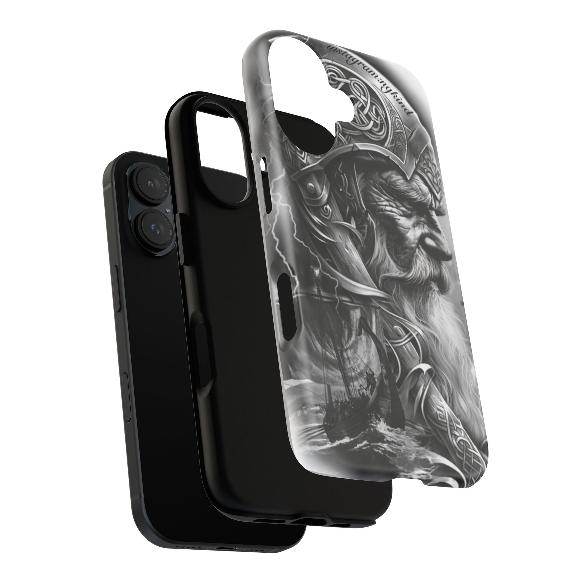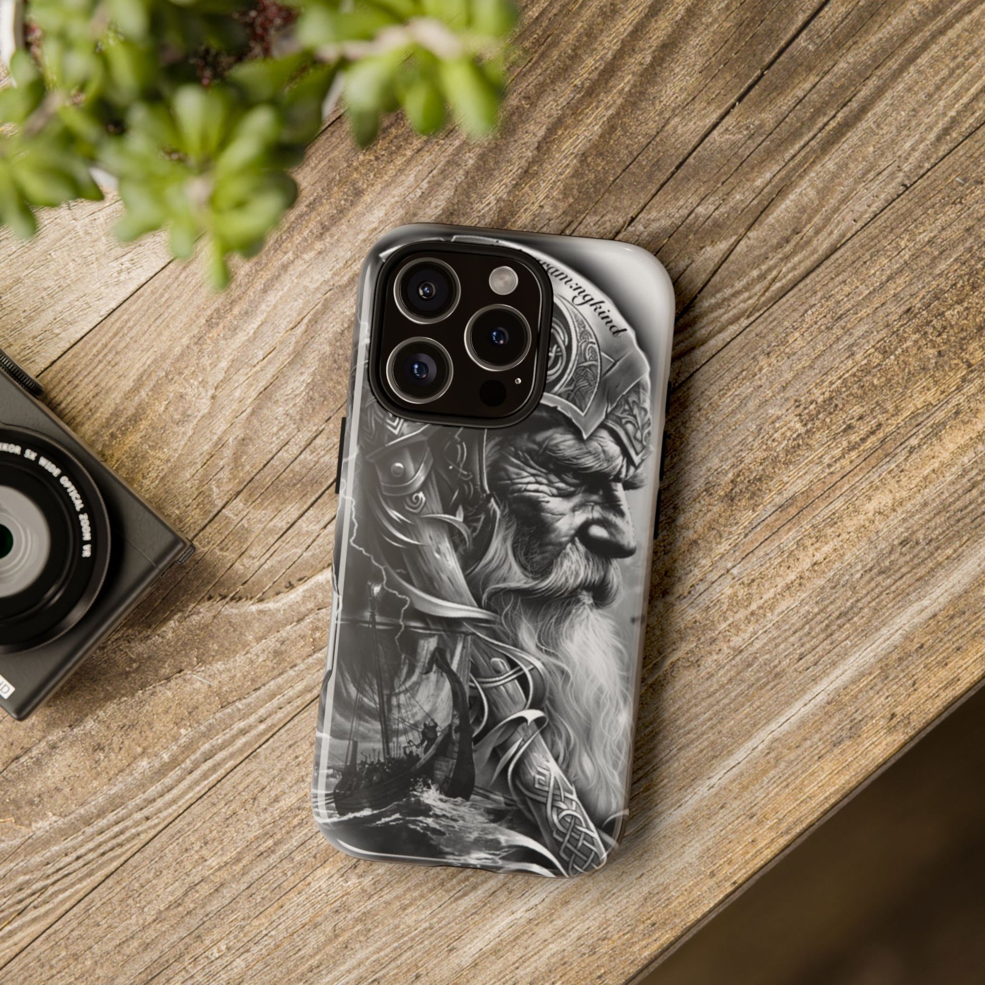 A powerful grayscale Viking-themed iPhone case featuring a detailed Norse warrior with braided beard, ornate helmet engravings, and a longship sailing through stormy seas. Perfect for fans of Vikings, Odin lore, Nordic history, and ancient warrior spirit. Bold, mythic, and masculine—ideal for those who love strength, battle aesthetics, and warrior heritage style.