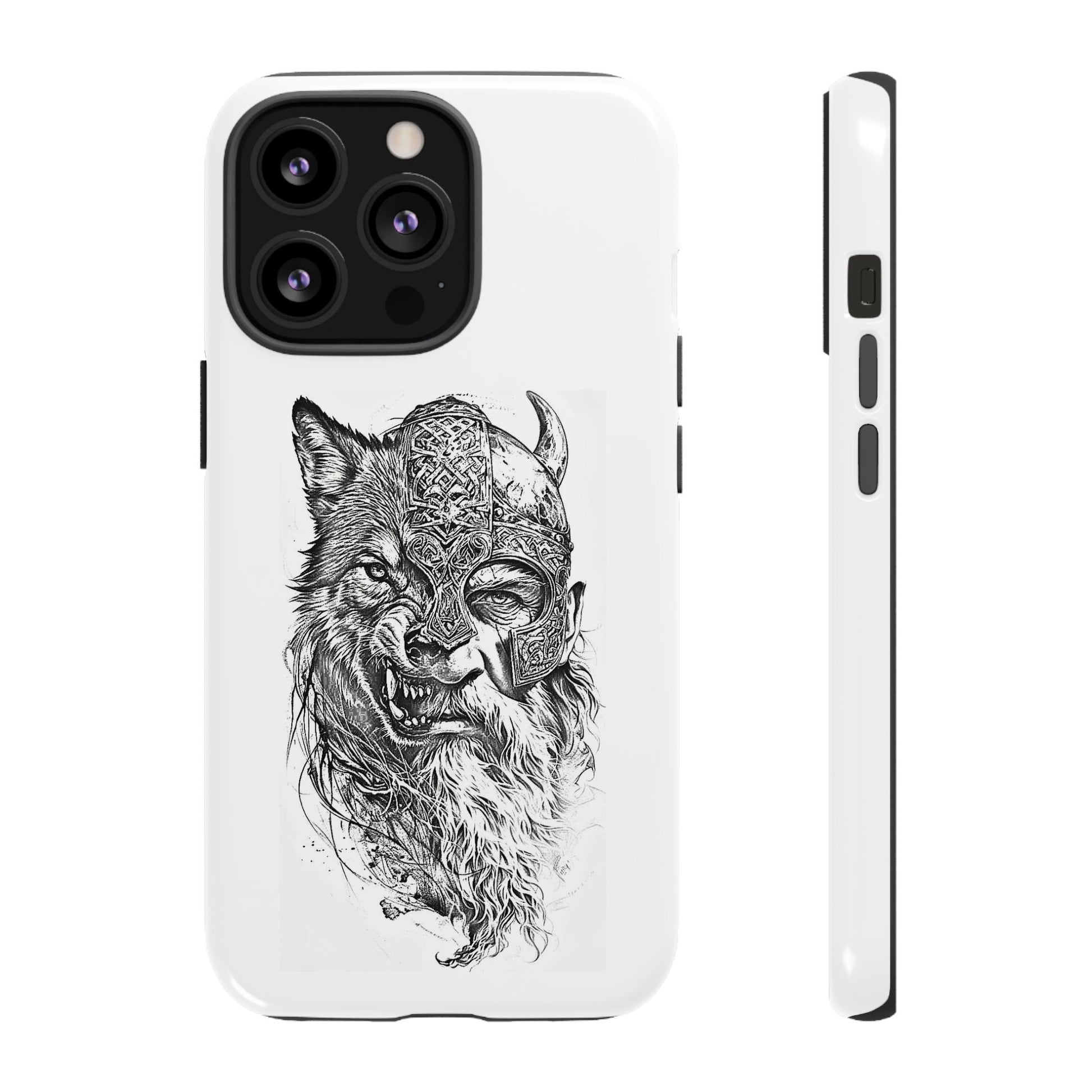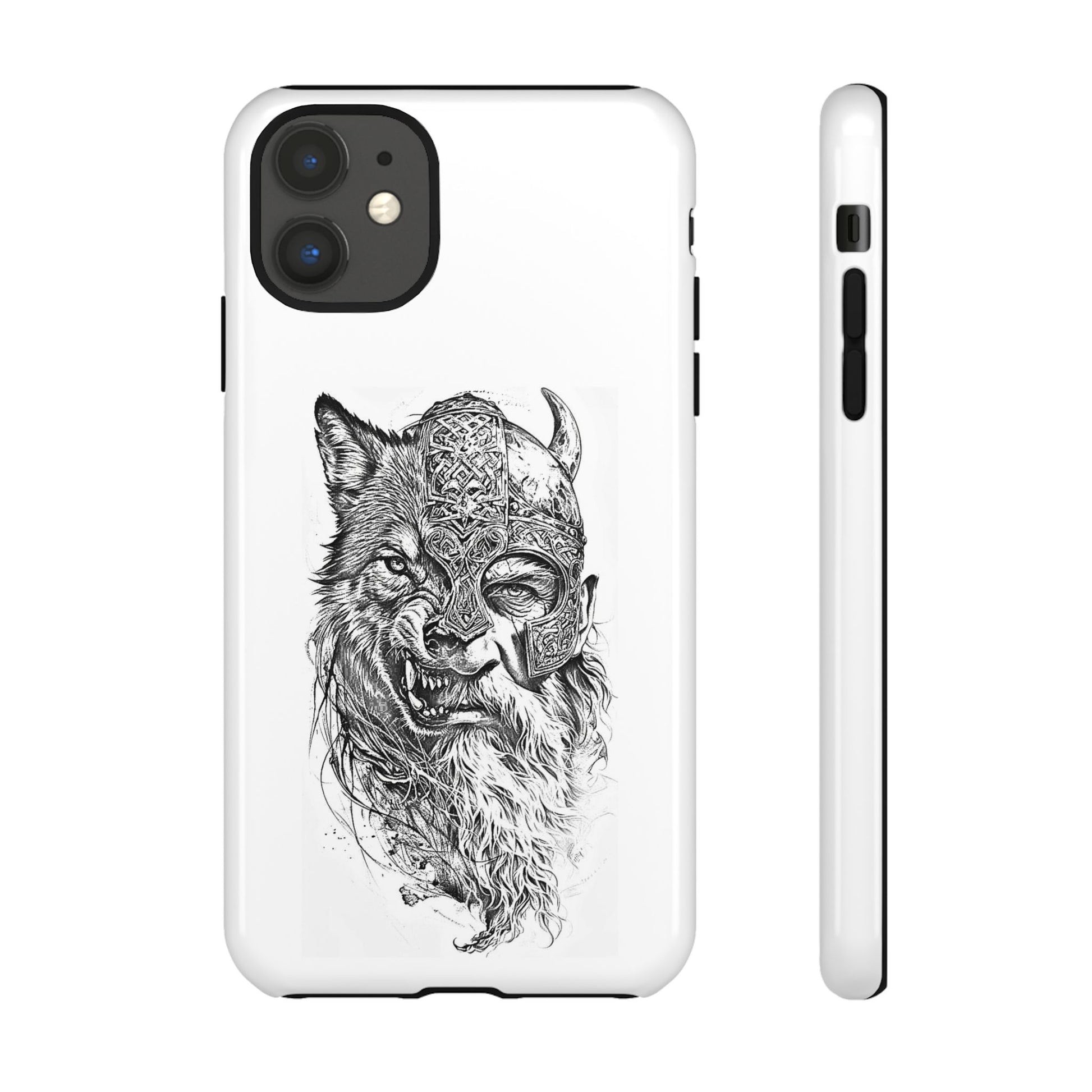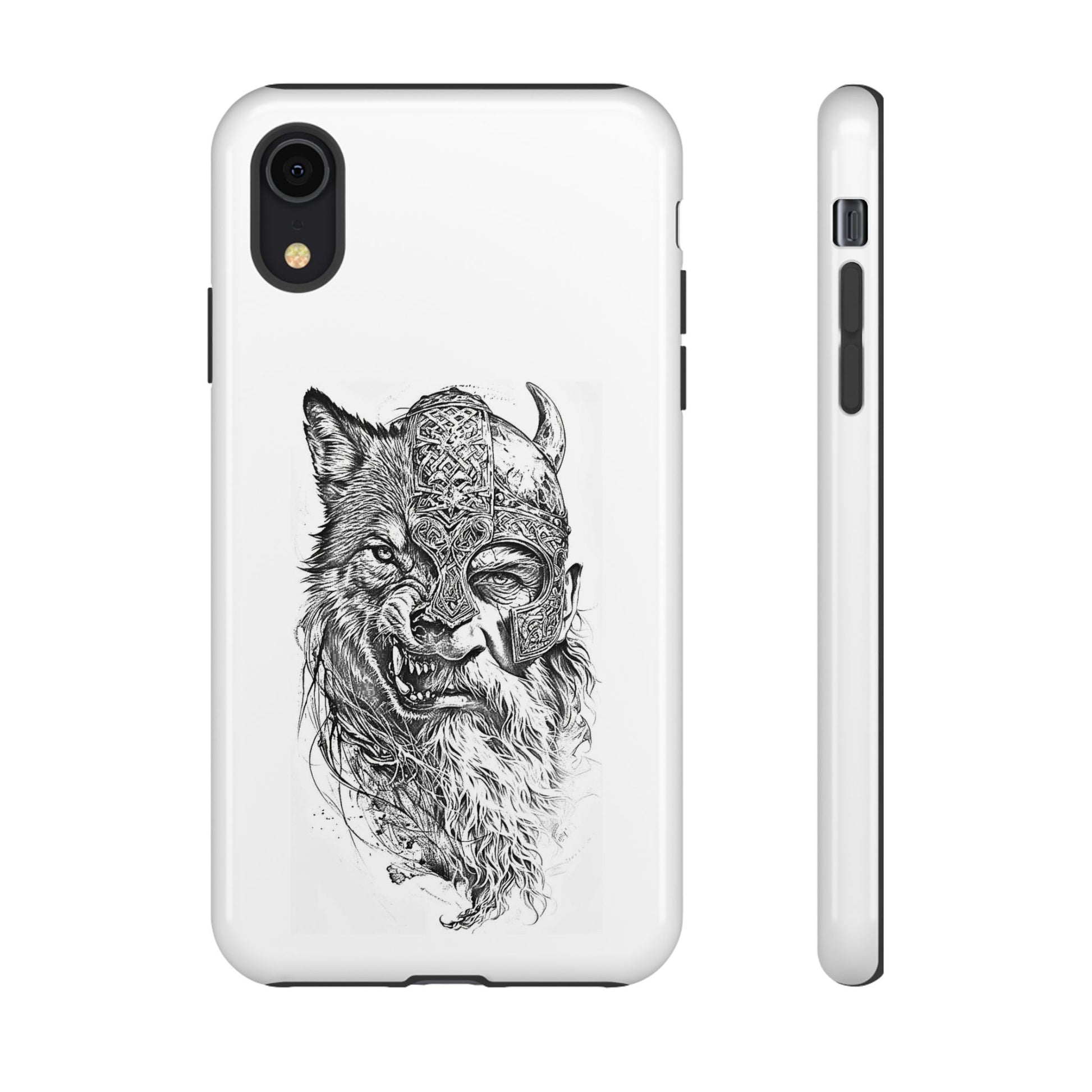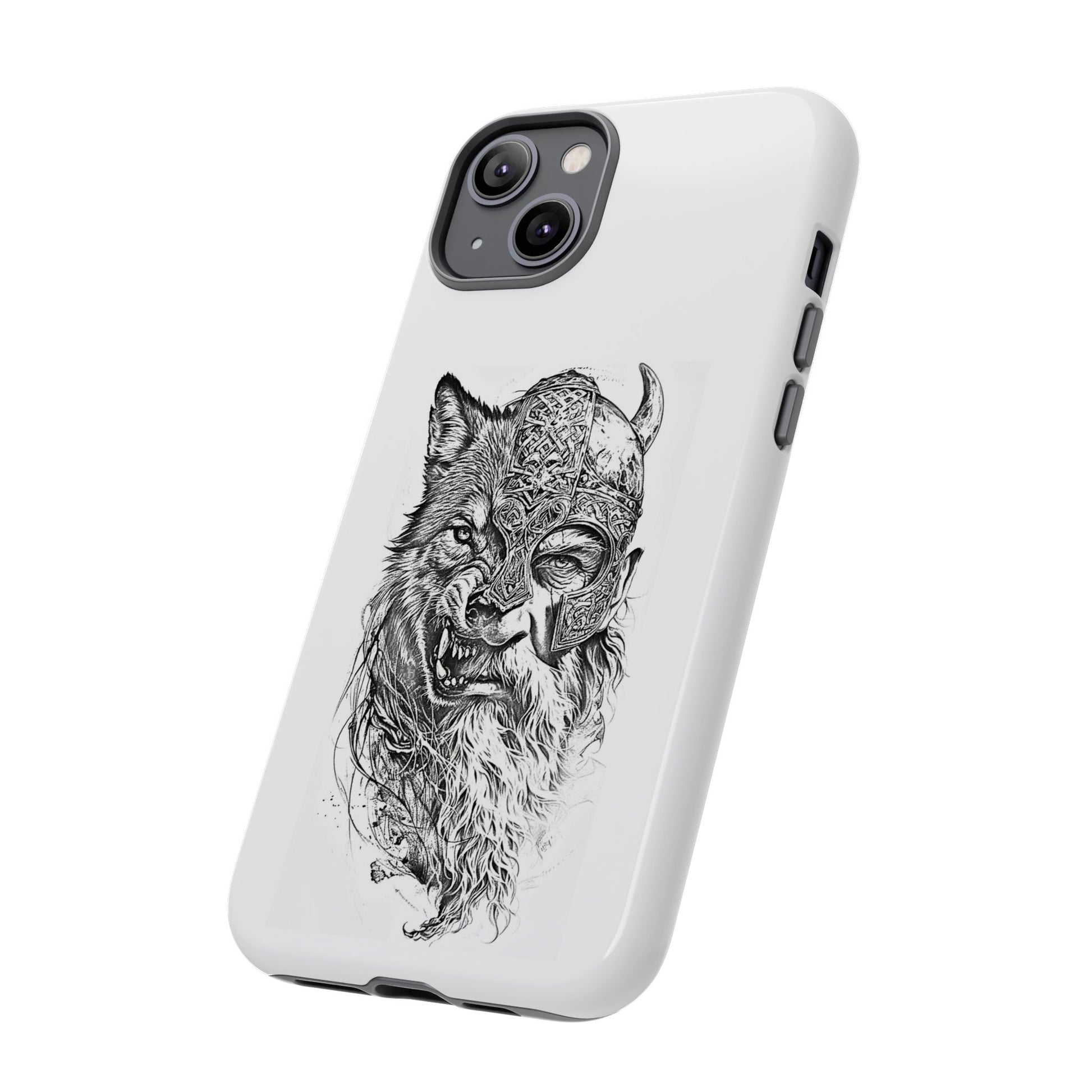 A fierce Norse-themed iPhone case featuring a powerful fusion of Viking warrior and wolf spirit, united by an intricately detailed horned helmet. Half-man, half-wolf imagery symbolizes strength, courage, and primal instincts. Perfect for fans of Nordic mythology, Valhalla culture, and warrior aesthetics. A striking, bold accessory for those who carry the spirit of the wolf within.