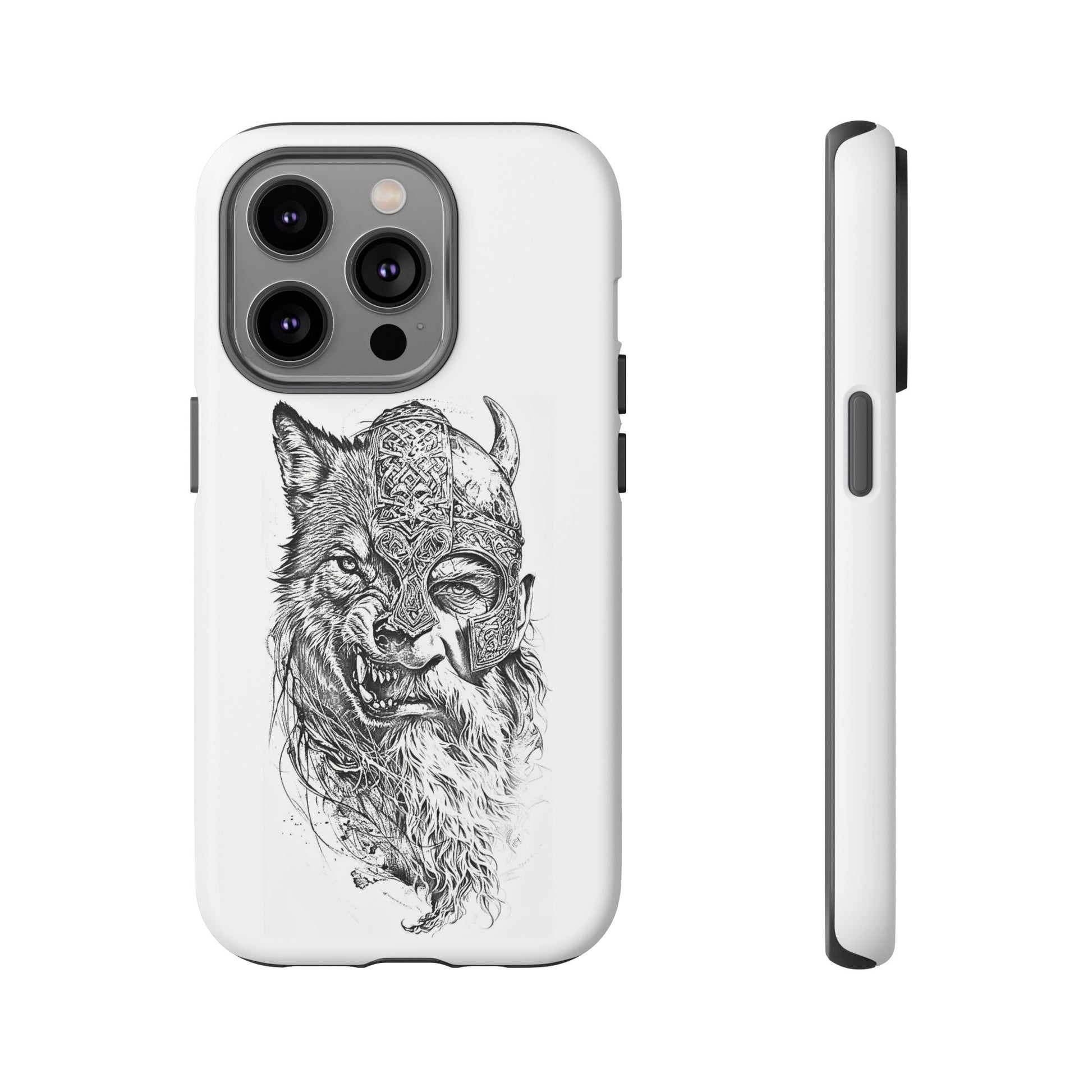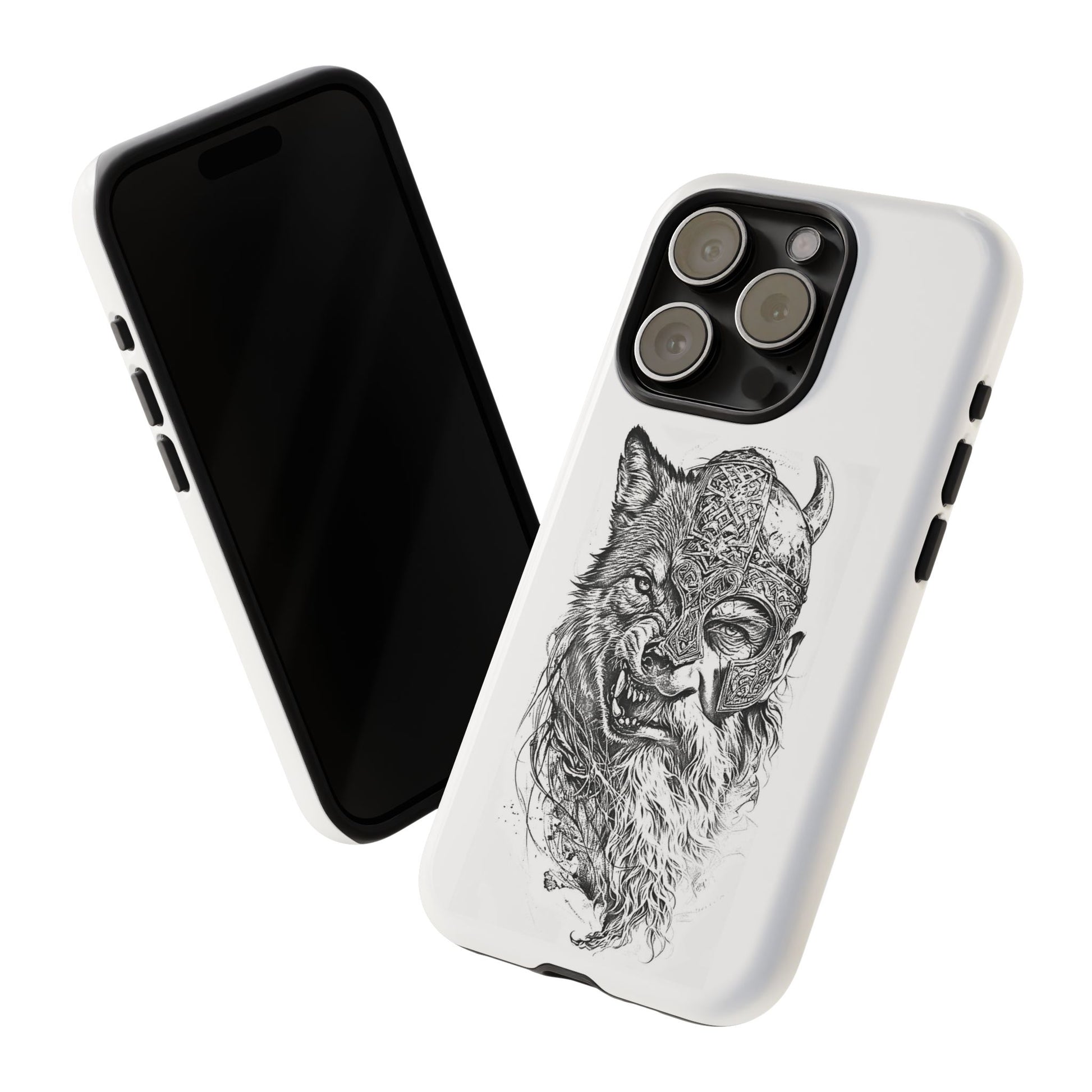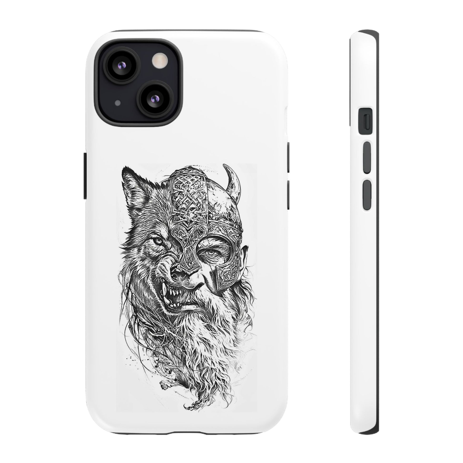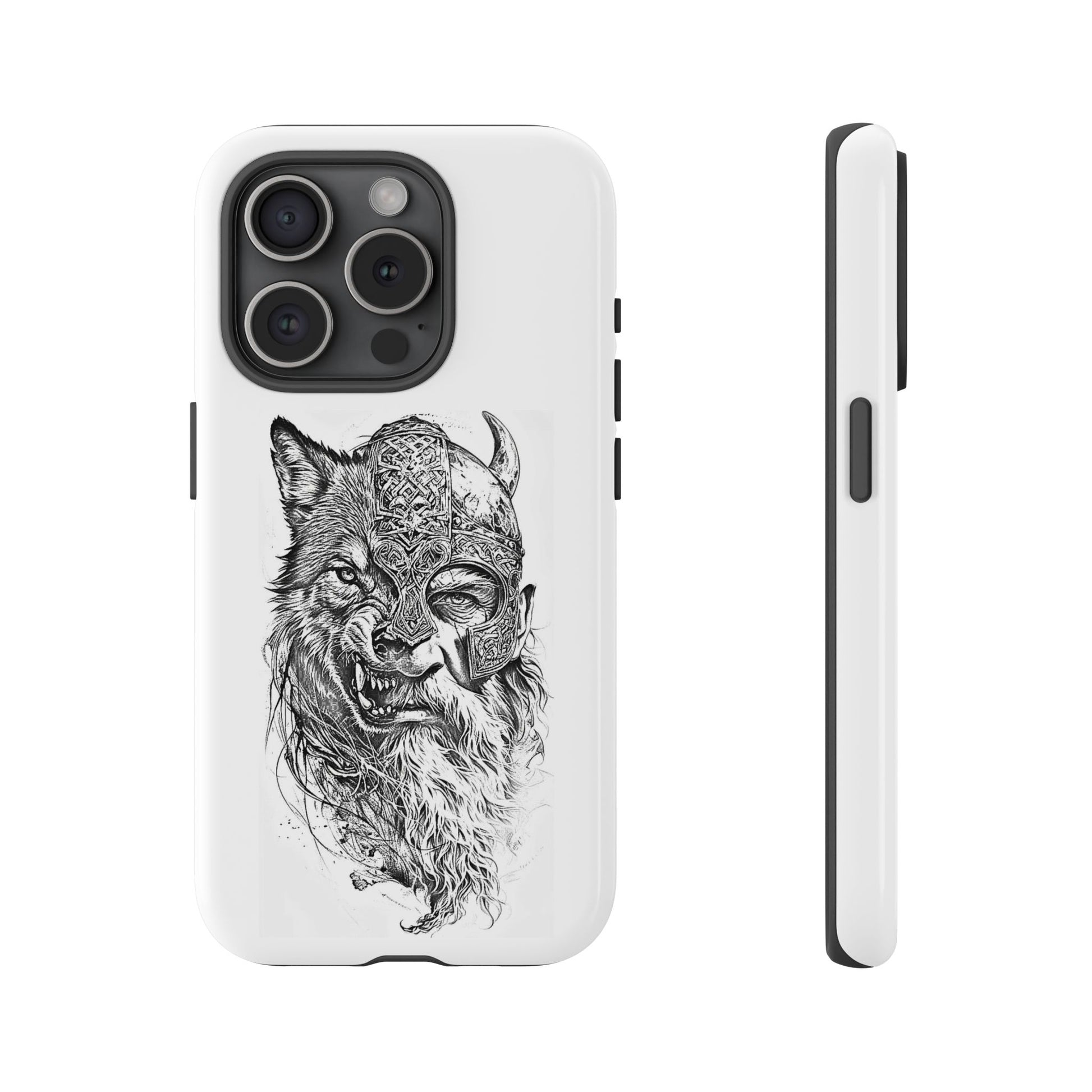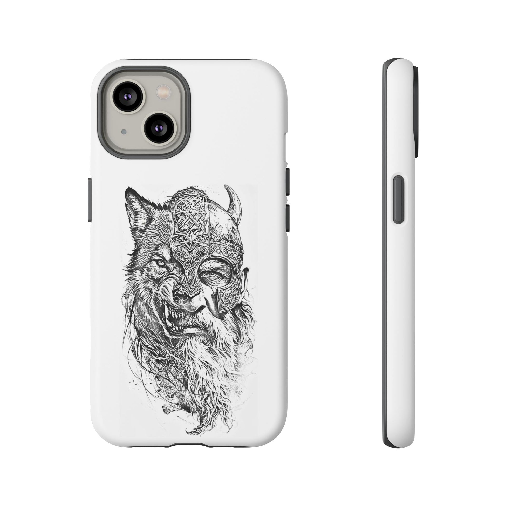 A fierce Norse-themed iPhone case featuring a powerful fusion of Viking warrior and wolf spirit, united by an intricately detailed horned helmet. Half-man, half-wolf imagery symbolizes strength, courage, and primal instincts. Perfect for fans of Nordic mythology, Valhalla culture, and warrior aesthetics. A striking, bold accessory for those who carry the spirit of the wolf within.