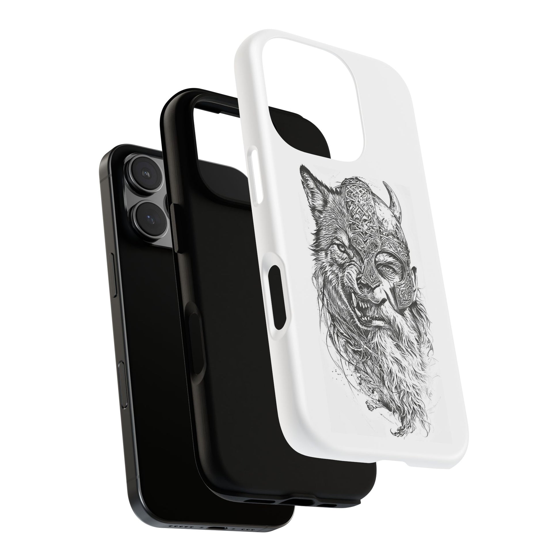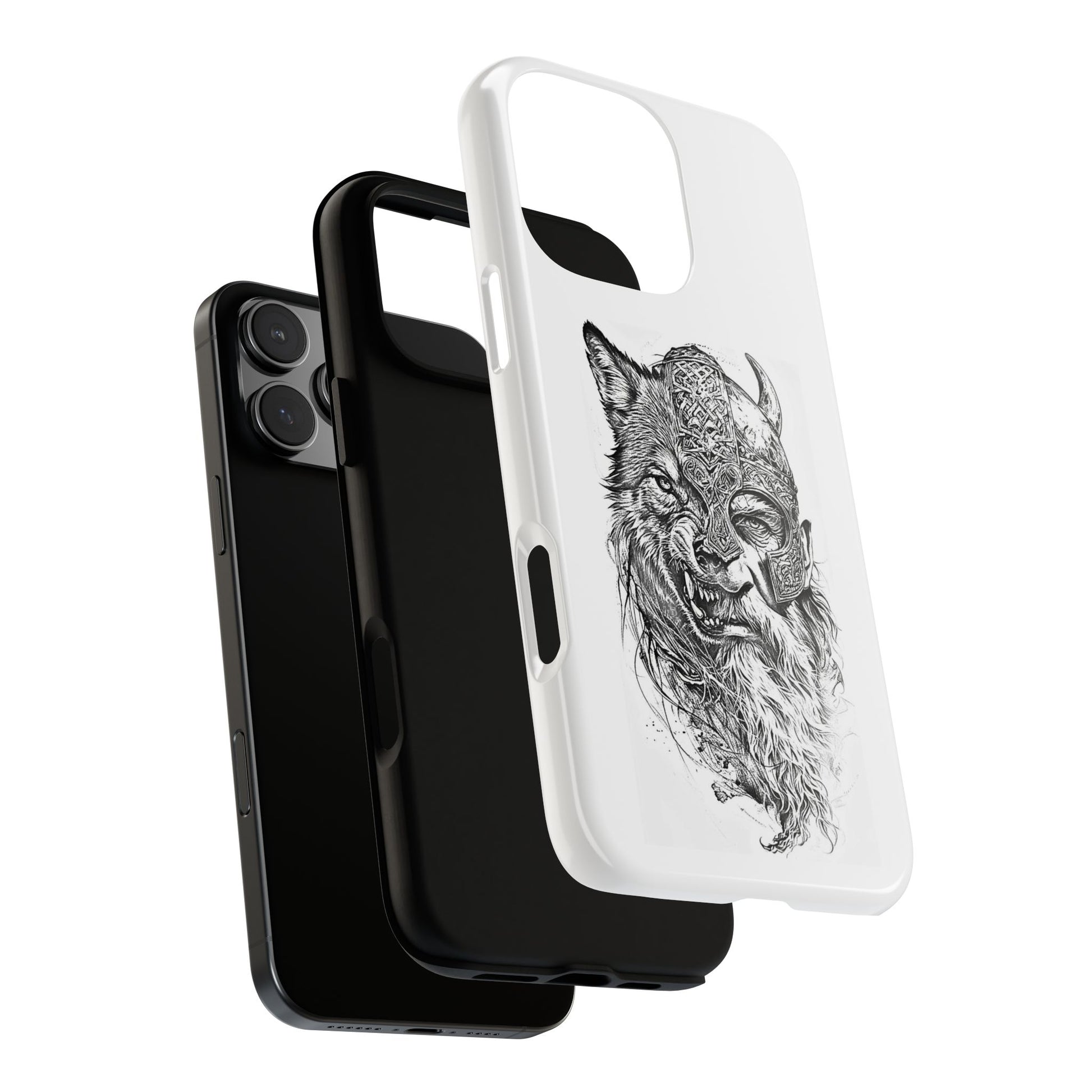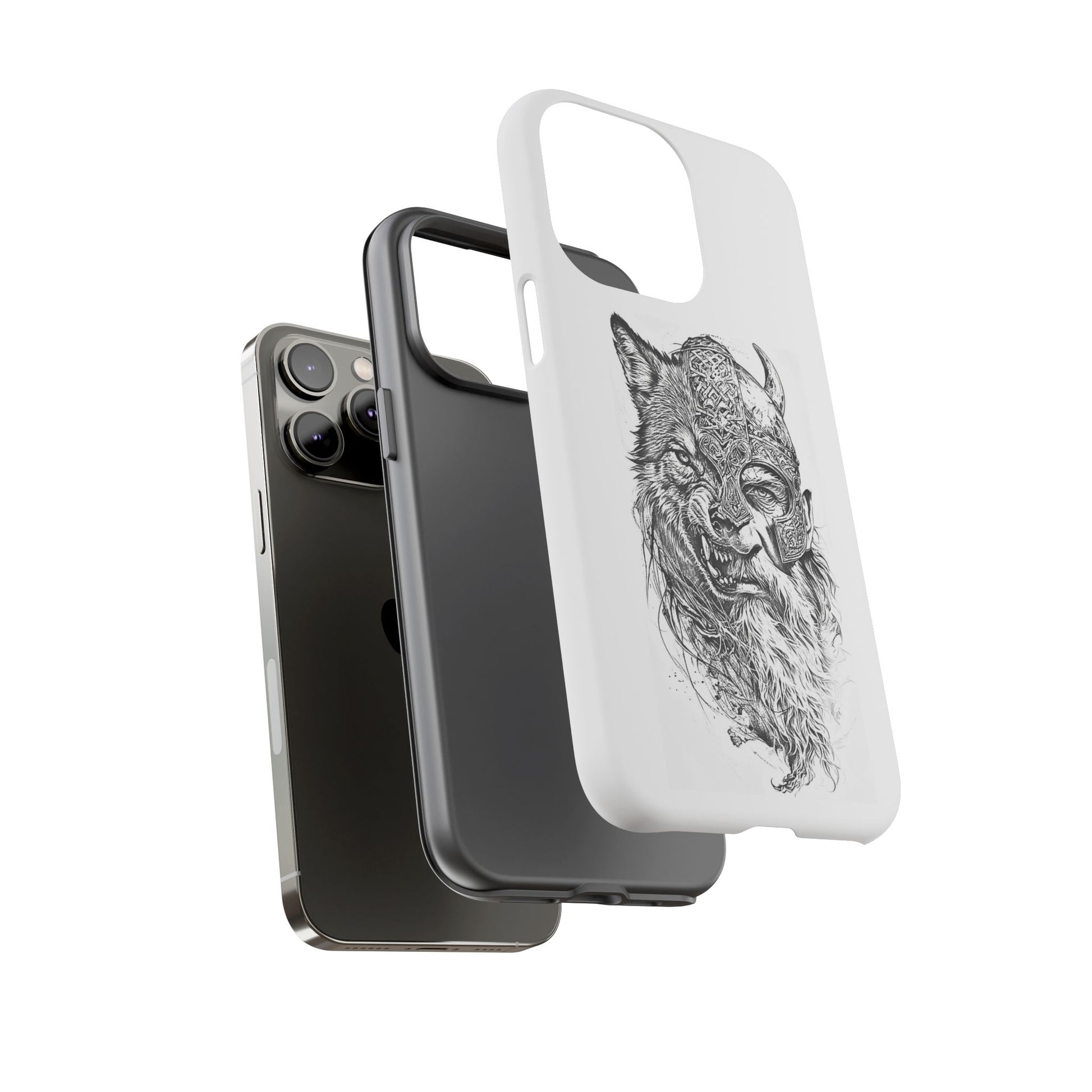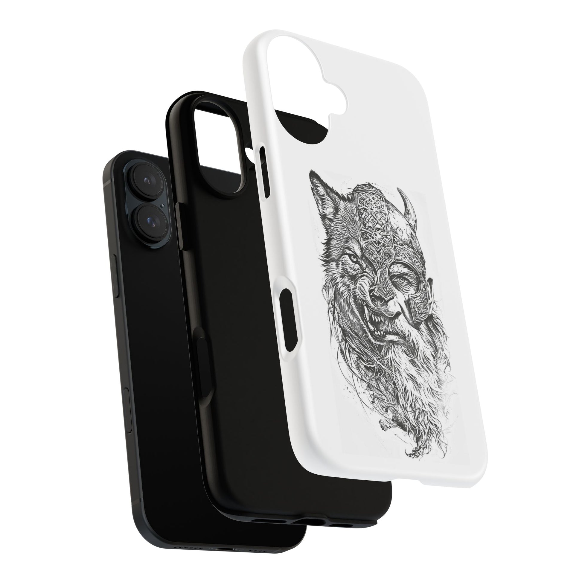 A fierce Norse-themed iPhone case featuring a powerful fusion of Viking warrior and wolf spirit, united by an intricately detailed horned helmet. Half-man, half-wolf imagery symbolizes strength, courage, and primal instincts. Perfect for fans of Nordic mythology, Valhalla culture, and warrior aesthetics. A striking, bold accessory for those who carry the spirit of the wolf within.