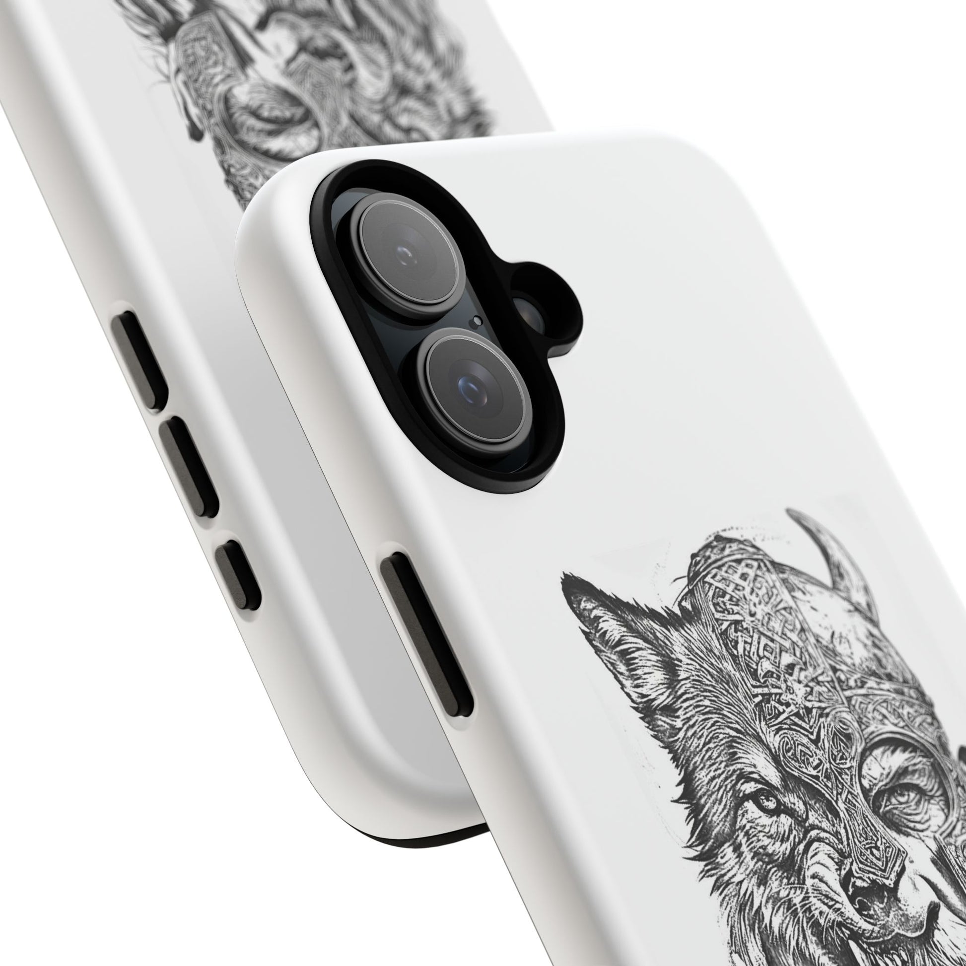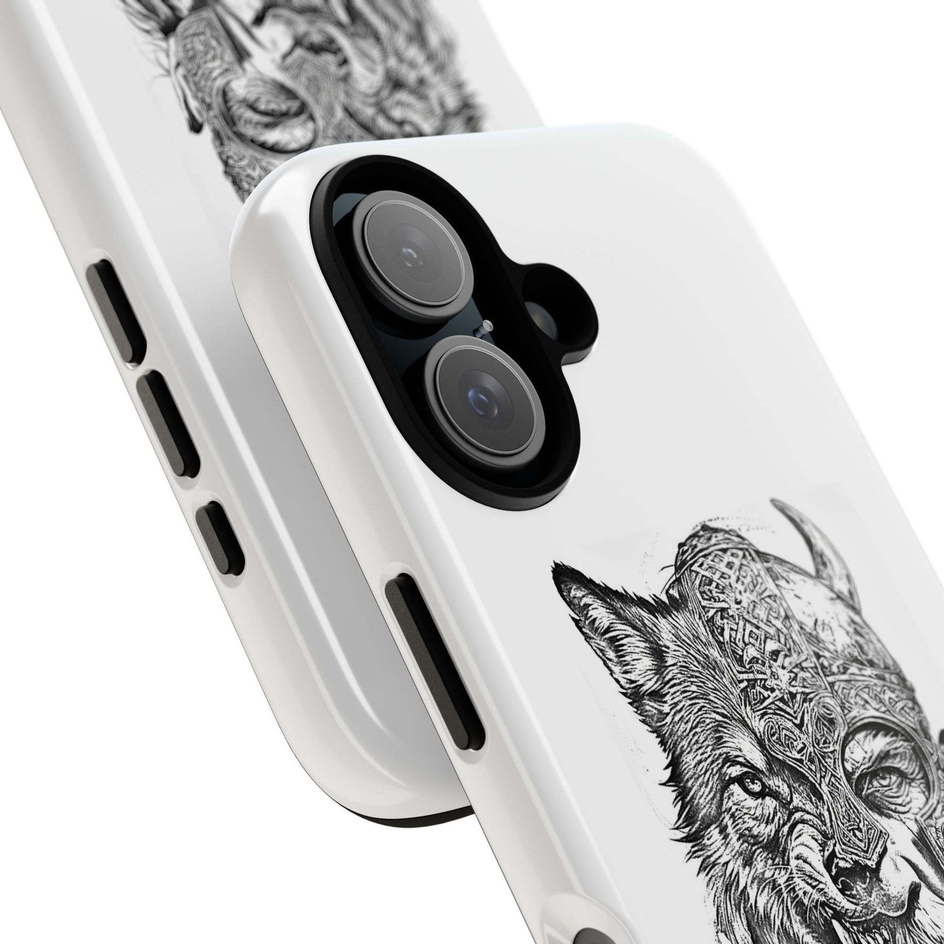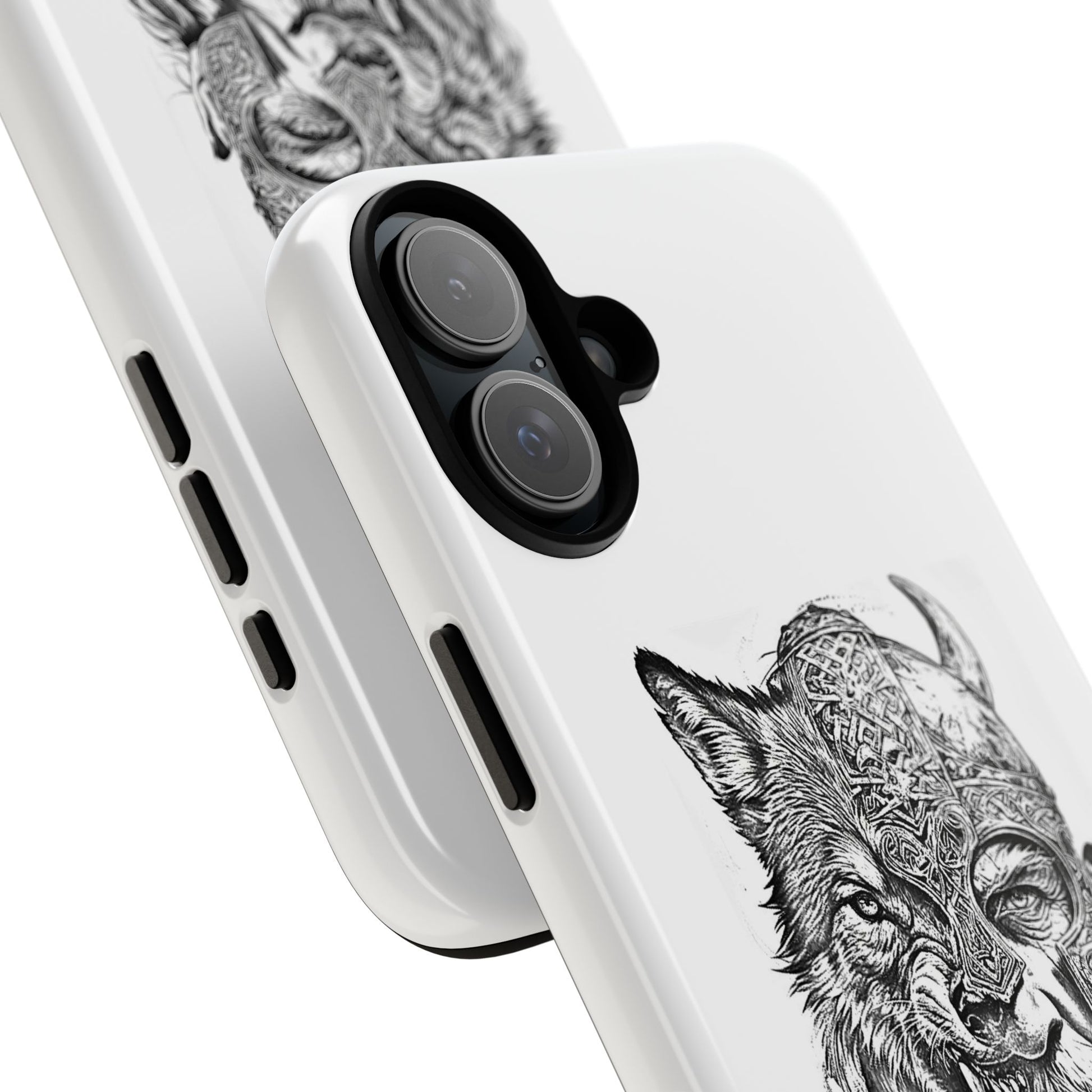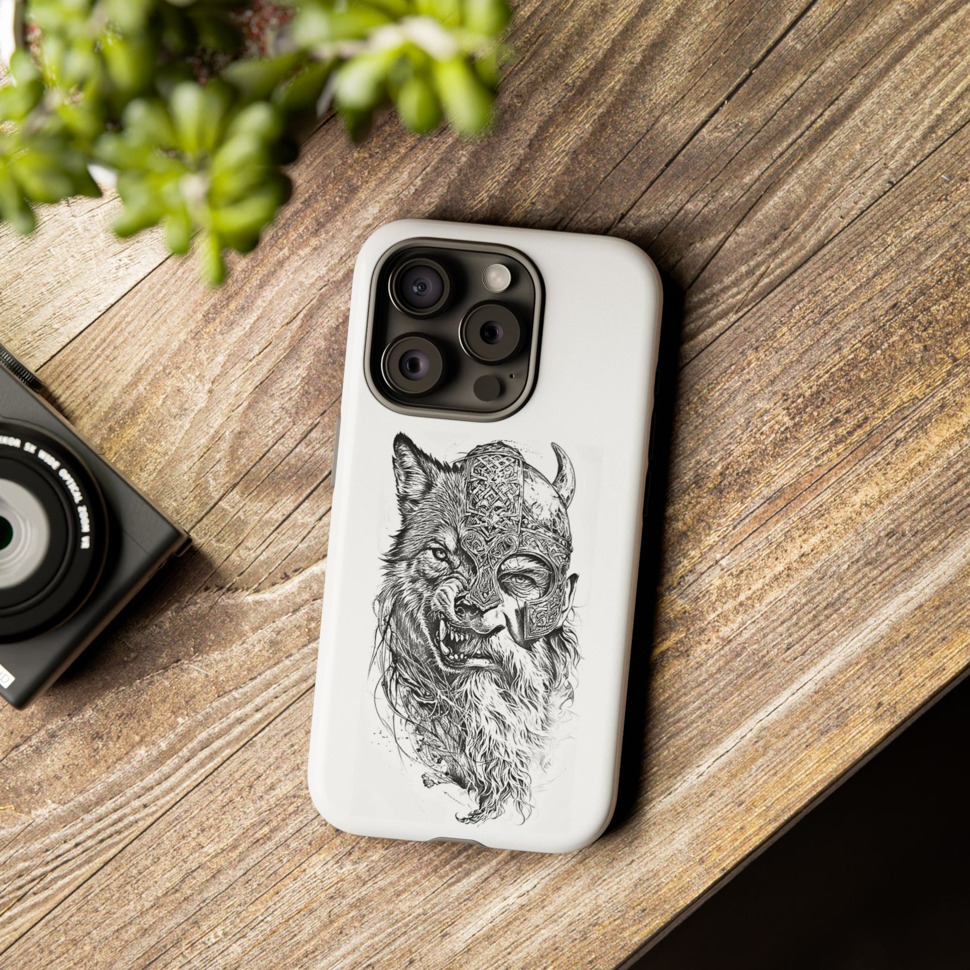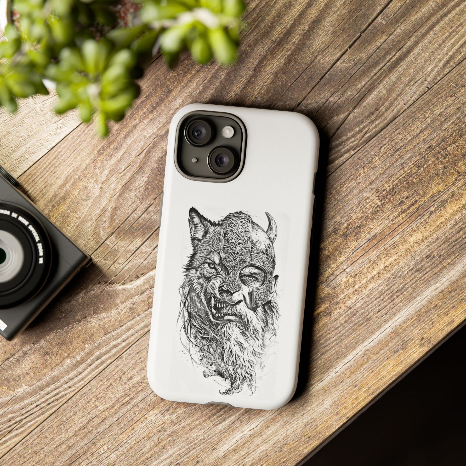 A fierce Norse-themed iPhone case featuring a powerful fusion of Viking warrior and wolf spirit, united by an intricately detailed horned helmet. Half-man, half-wolf imagery symbolizes strength, courage, and primal instincts. Perfect for fans of Nordic mythology, Valhalla culture, and warrior aesthetics. A striking, bold accessory for those who carry the spirit of the wolf within.