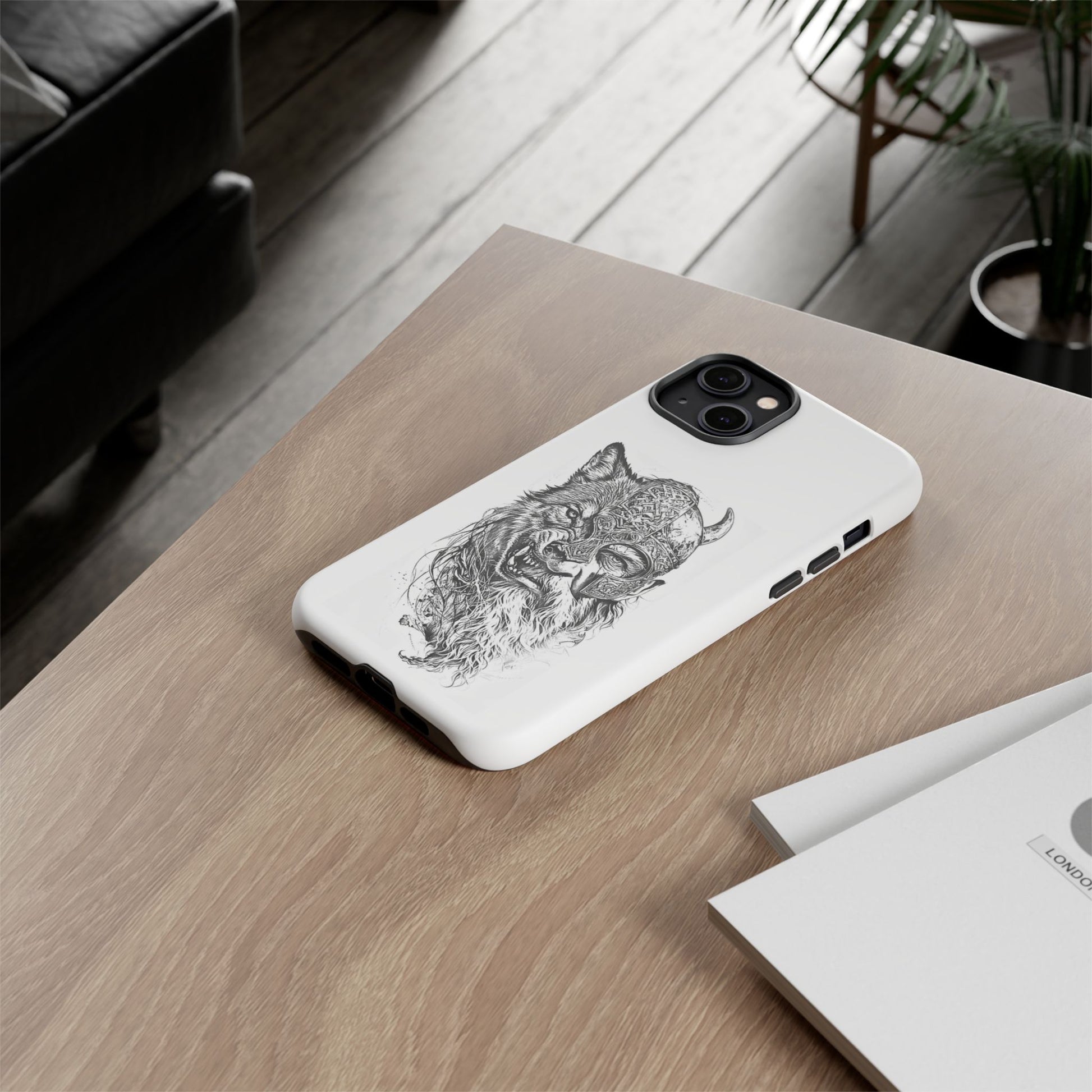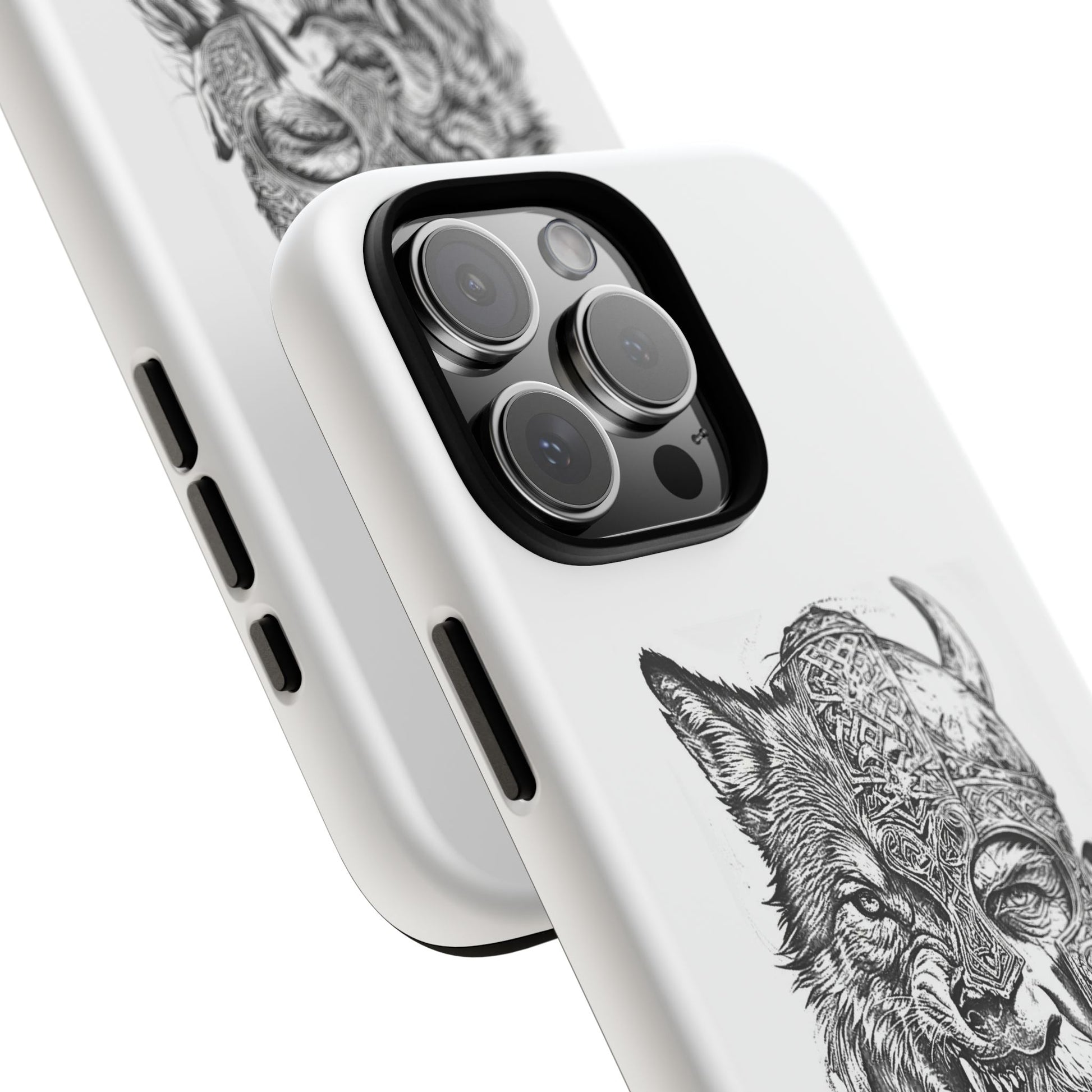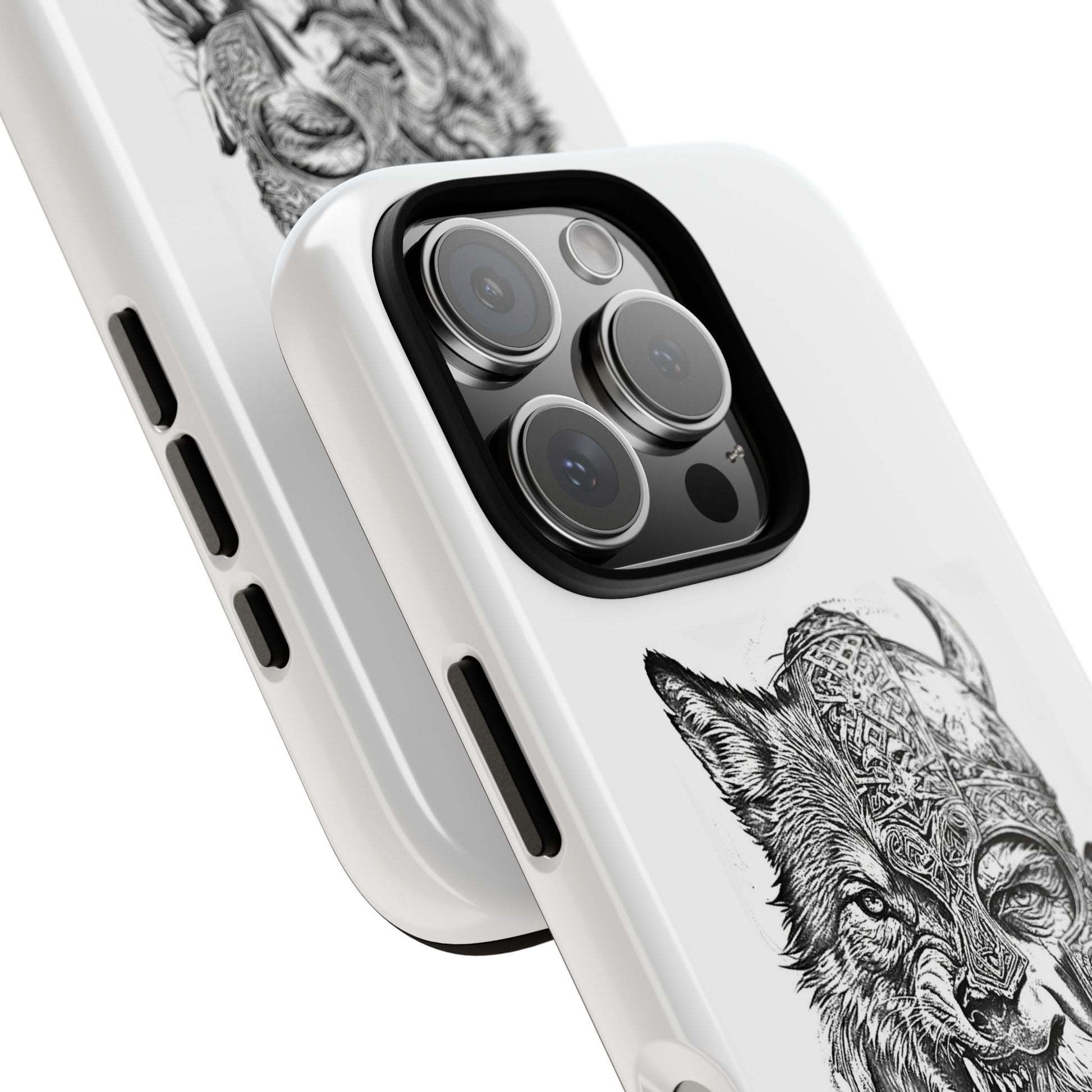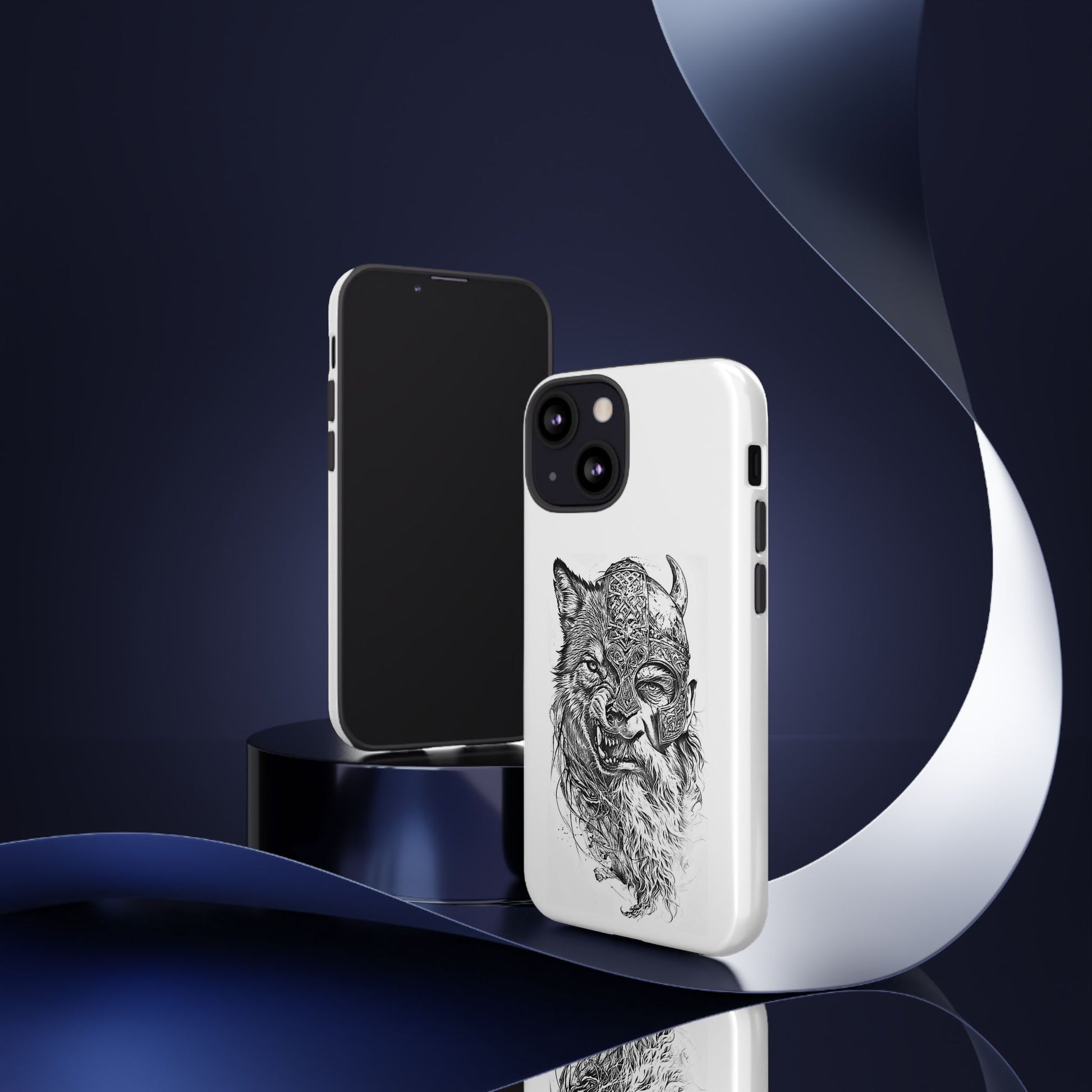 A fierce Norse-themed iPhone case featuring a powerful fusion of Viking warrior and wolf spirit, united by an intricately detailed horned helmet. Half-man, half-wolf imagery symbolizes strength, courage, and primal instincts. Perfect for fans of Nordic mythology, Valhalla culture, and warrior aesthetics. A striking, bold accessory for those who carry the spirit of the wolf within.